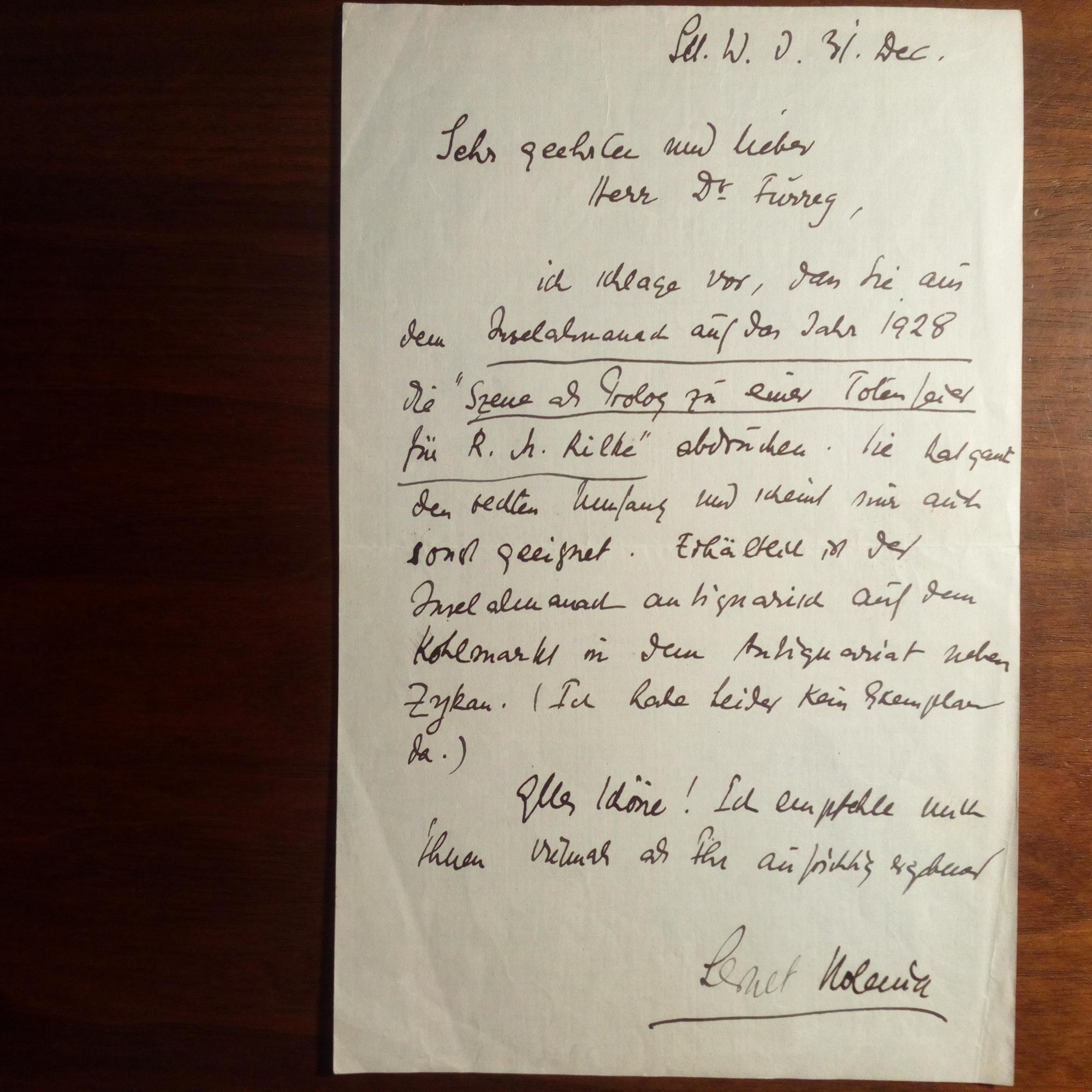 1897-1977, österr. Schriftsteller - E. Brief mit U., Salzburg 31.12. (um 1950), 1 S. 8°. An den Theaterregisseur und Publizisten Herbert Fureg (1897-1958) in Salzburg: ...schlage vor, daß Sie aus dem Inselalmanach auf das Jahr 1928 die "Szene als Prolog zu einer Totenfeier für R.M. RILKE" abdrucken... Beiliegen: Papierstreifen mit mont. kl. Zeitungsfoto und U., Karte mit U. und Faksimile-Gedicht von Rilke.
