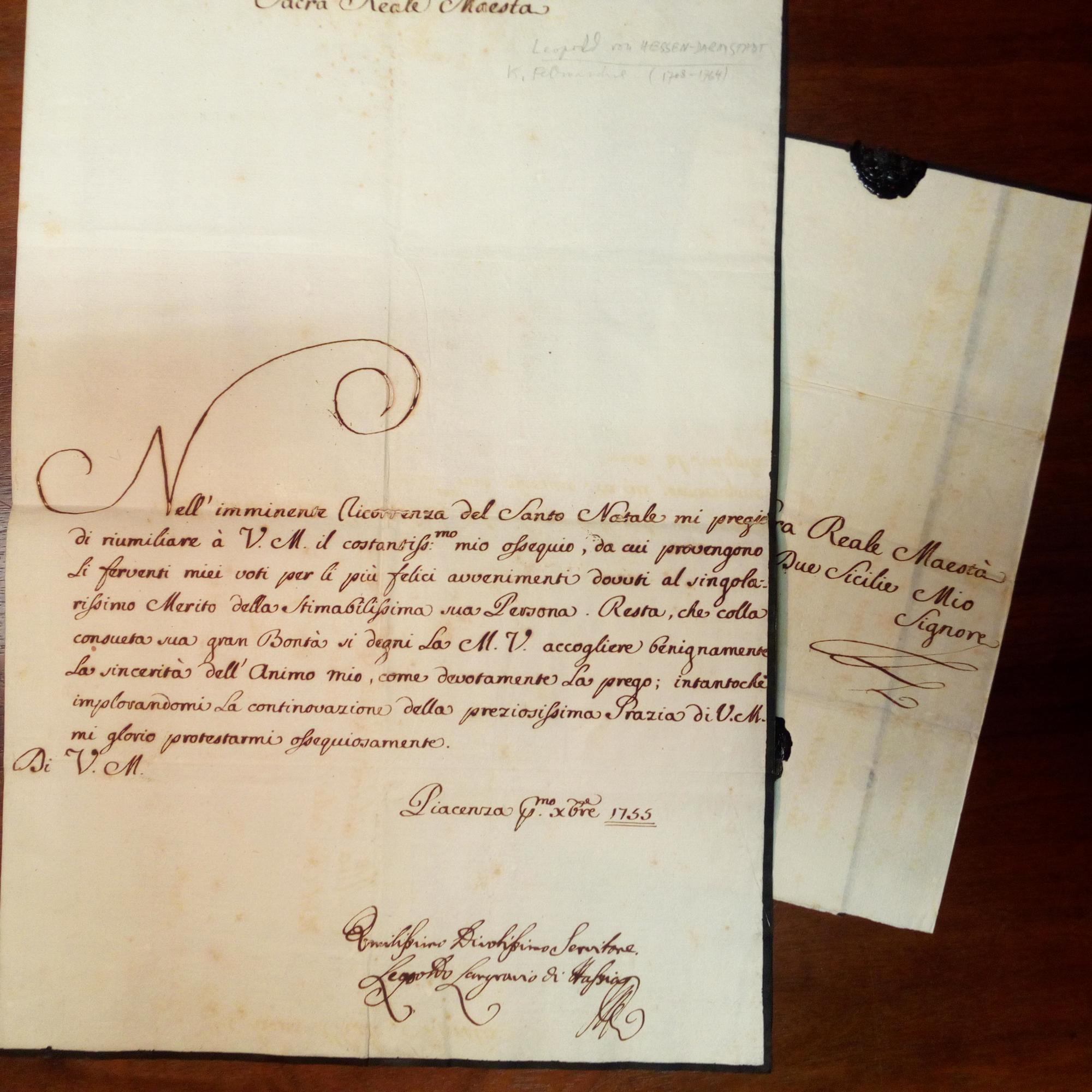 1708-64, Landgraf und kaiserl. Feldmarschall - Brief mit E. und U., Piacenza 7.10.1755, 1 S. folio, schw. Rand. Mit Umschlagblatt mit Adresse, 2 Siegel, ger. Altersspuren. Weihnachtswünsche "Alla Sacra Reale Maesta Del Ré delle Due Sicilie". (Karl V.)