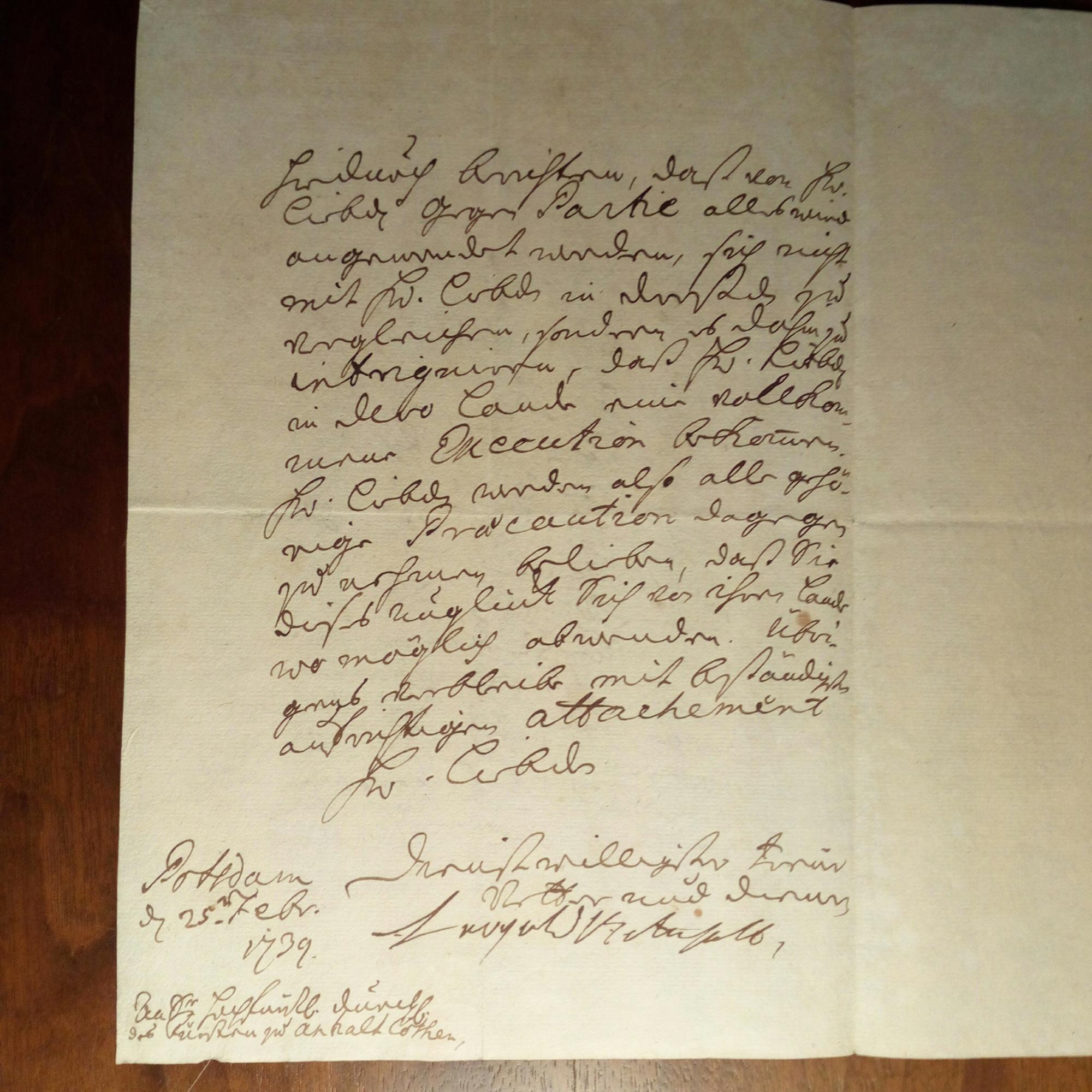 1676-1747, Fürst, preuß. Generalfeldmarschall unter Friedrich II. - Brief mit U., Potsdam 25.2.1739, 2 S. 4°. Papierdeckung des Siegels liegt bei. An Fürst August von Anhalt-Köthen (1697-1755) betr. Vermittlung im Streit mit Graf Albrecht Wolfgang von Schaumburg-Lippe (1699-1748): ...muß Ew. Liebden hierdurch berichten, daß von Ew. Liebden Gegen Partie alles wird angewendet werden, sich nicht...zu vergleichen, sondern es dahin zu intriguiren, daß Ew. Liebden in Dero Lande eine vollkommene Execution bekommen. Ew. Liebden werden also alle Praecaution dagegen zu nehmen belieben, daß Sie dises unglück...wo möglich abwenden...