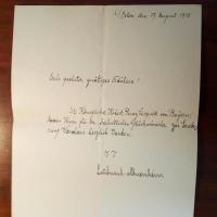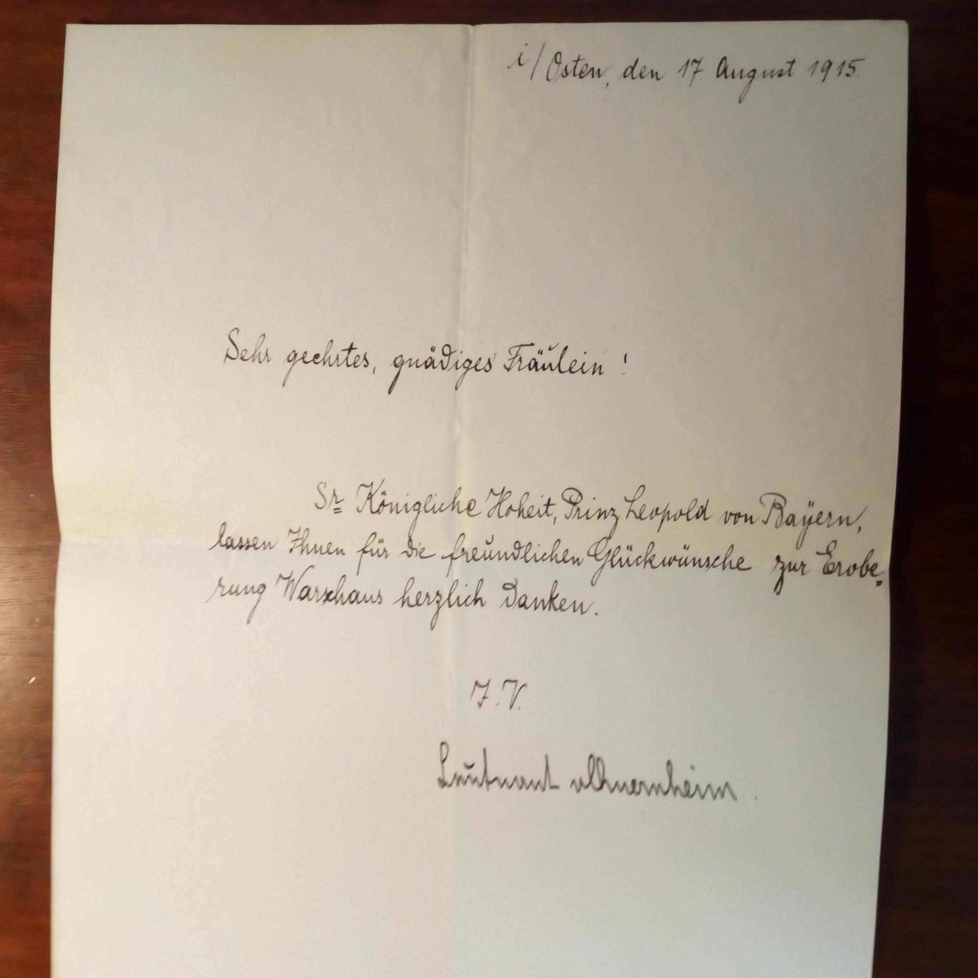 1846-1930, Prinz, preuß. Generalfeldmarschall - Feldpost-Brief mit U. (in seinem Namen von seinem Adjutanten Leutnant Felix von Quernheim, 1891-1966), "i/Osten" 17.8.1915, ¾ S. 4°, mit e. postal. Umschlag (Stempel des Oberkommandos der 9. Armee). Dankt einem Frl. in Baden (bei Wien) für Glückw. zur Einnahme Warschaus.
