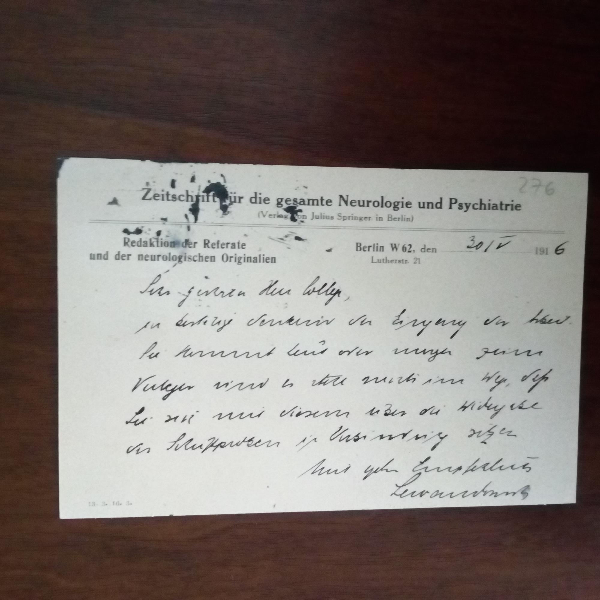 1876-1918, Neurologe - E. postal. Postkarte m. U., Br.kopf als Mitredakteur (zus. m. Aloys Alzheimer) der "Zeitschrift für die gesamte Neurologie und Psychiatrie" (Br.kopf), Berlin 30.5.1916, etw. tintenfleckig. An den "Collegen" R. Ammann in Berlin: Bestätigt den Eingang einer Arbeit und Bemerkungen dazu.