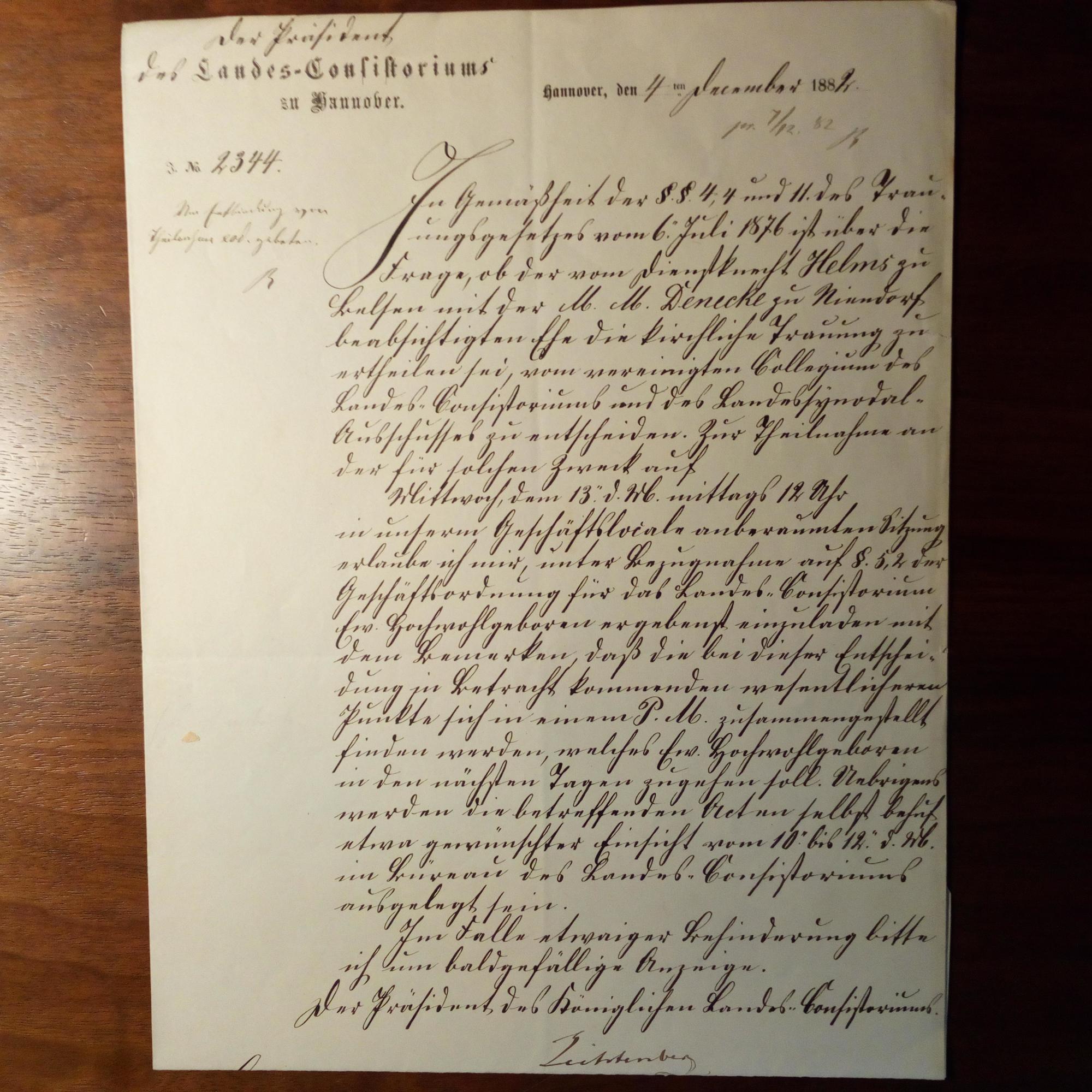 1816-83, Kirchenpolitiker - 2 amtl. Schreiben mit U. An Landesgerichtspräs. Georg Friedrich Roscher (1818-92) in Göttingen: 14.6.1880, ½ S. folio, Kopierstift, Briefkopf als Präs. des Landeskonsistoriums. Betr. Druck eines Gesangsbuches. Und 4.12.1882, ähnl., 1 S. 4°, dicht beschr., Siegelmarke, Einladung zur Sitzung, in der entschieden werden soll, "ob der vom Dienstknecht Helms zu Belsen mit der M.M. Denecke von Neindorf beabsichtigten Ehe die kirchliche Trauung zu ertheilen sei...".