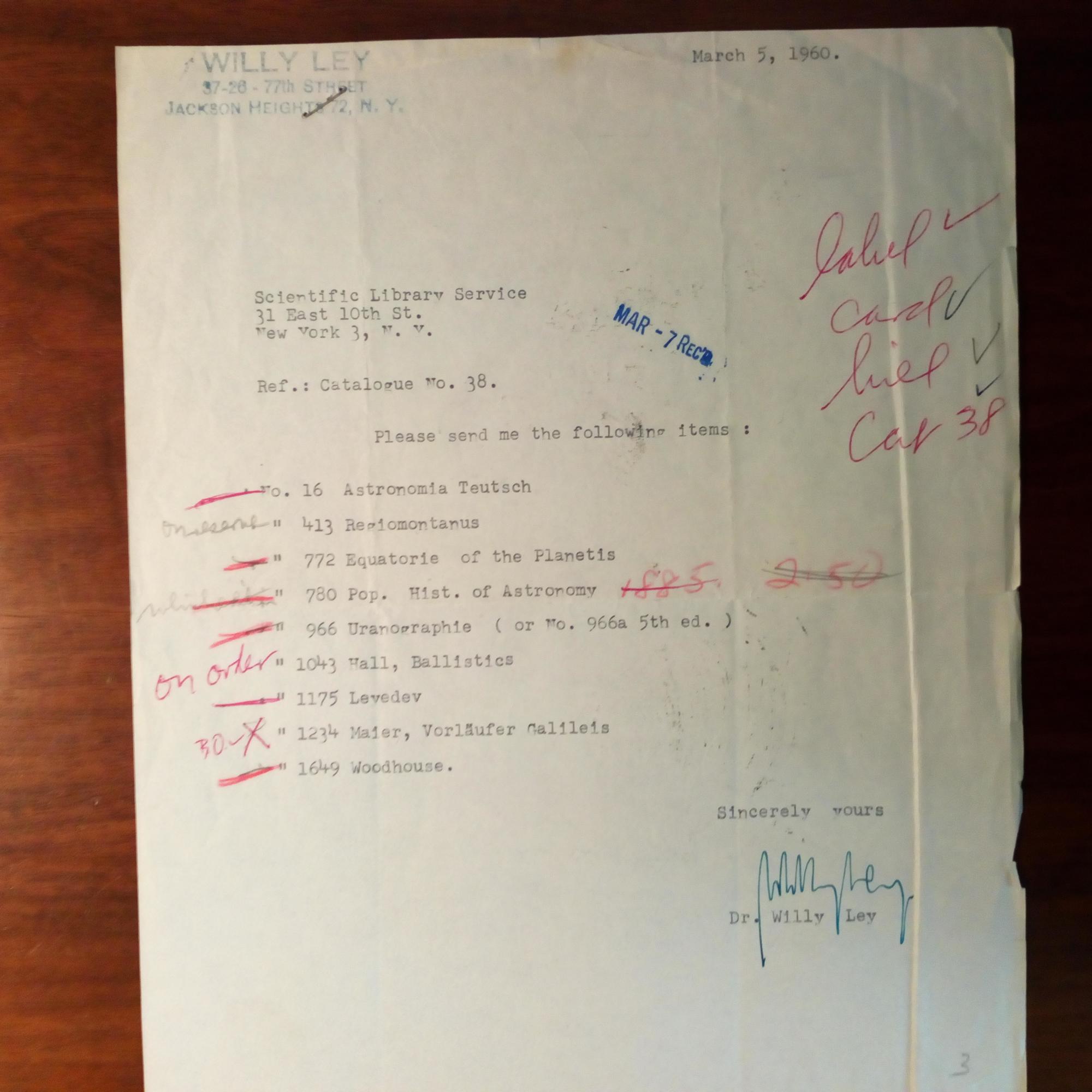 1906-69, dt.-amerikan. Astronom, Raumfahrt-Techniker und populärwiss. Publizist - Brief mit U., ¾ S. 4°, Abs.stempel, Bearb.spuren. Bestellt beim "Scientific Library Service" in New York 9 alte astronomische Publikationen (u.a. Galilei).