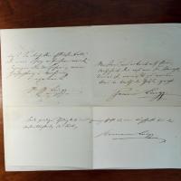 1820-1905, Dichter - 1. Papierstreifen mit e. "In der geistigen Thätigkeit und Errungenschaft ist eine Bürgschaft für die Unsterblichkeit der Seele" und U., Faltspur. 2. E. Brief mit U., München 17.6.1876, 1 S. 8°, Bearb.notiz. An eine Redaktion: Bittet, eine Quellenangabe nachzutragen. 3. Ähnl. Brief, 13.2.1878, 2 S.. Dankt für ein Gedicht und entschuldigt den späten Dank mit seinem Augenleiden. 4. E. postal. Postkarte mit U., An den befreundeten Schriftsteller Ernst Heller (1856-1913) in Bern: Muss Besuch absagen. 5. E. Brief mit U., München 10.9.1901, ½ S., kl. Gebr.spuren. Erfüllt einer Sammlerin den Wunsch nach Autographen. Eines ist auf nächster S.: E. Vierzeiler mit U. Beiliegt 8°-Blatt mit e. Gedicht (2 Str. à 4 Z.) und U. 6. E. postal. Postkarte (27.1.1896) mit U., kl. Gebr.spuren. Dankt für Glückwünsche. 7. Kärtchen mit U., 21.7.1898. Will einer Einladung "der deutschen Studenten in Prag" Folge leisten. (9 Autogr.).