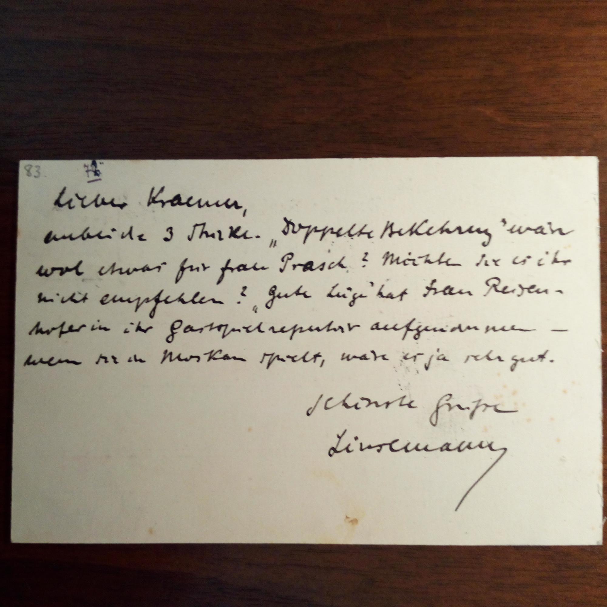 1871-1913, Dramatiker, Kritiker und Theaterintendant - E. postal. Postkarte mit U., (Berlin 6.11.1895). An den Journalisten Eduard Kraemer, Berlin: ...anbei die 3 Stücke: "Doppelte Bekehrung" wäre wohl etwas für Frau Praisch (Auguste Praisch-Grevenberg, Schauspielerin)..."Gute Lüge" hat Frau (Marie) Reisenhofer in ihr Gastspielrepertoir aufgenommen...