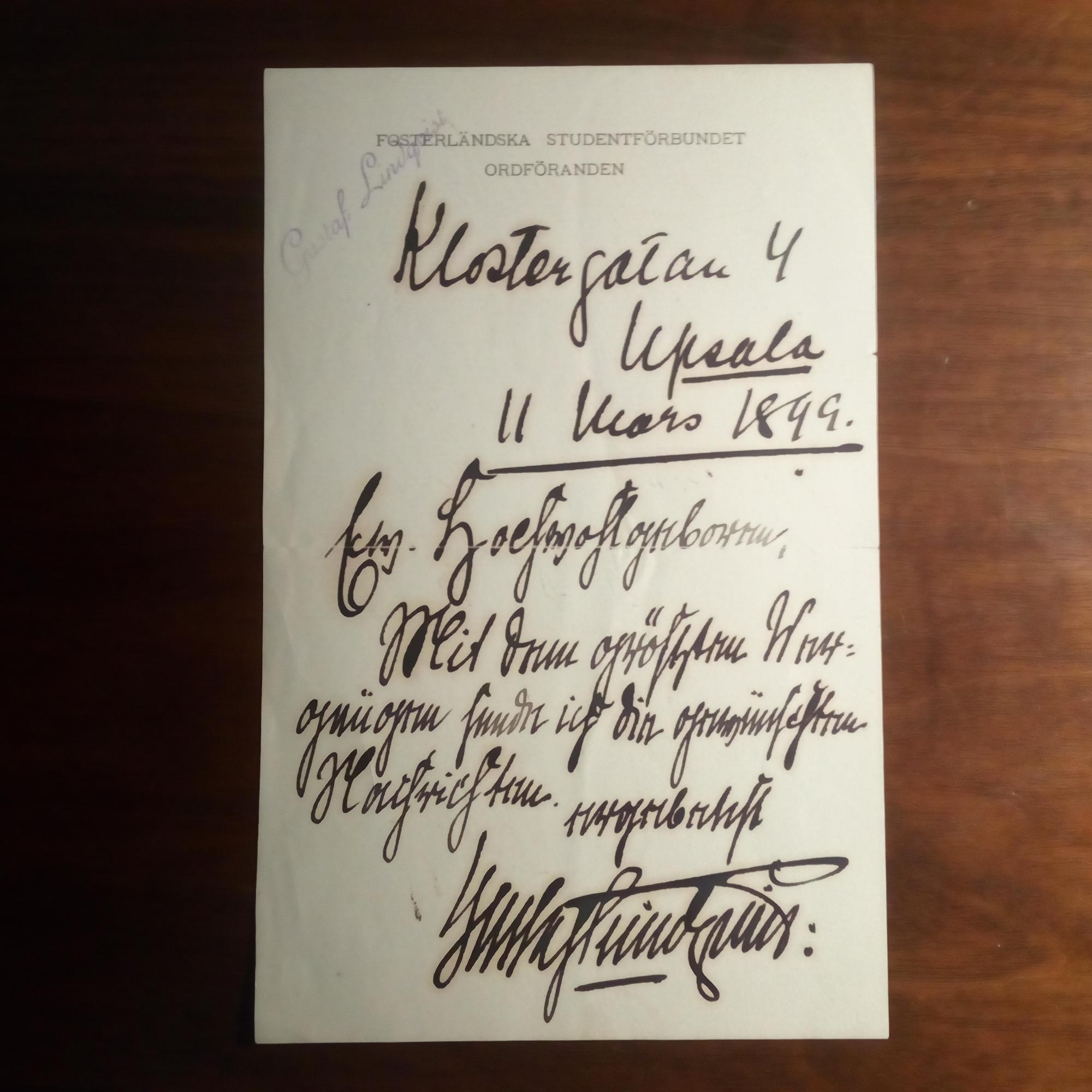 1872-1946, schwed. Schriftsteller - E. Br. m. U., Uppsala 20.1.1899, 3 S. 8°, Namensstempel, ger. Faltspuren, m. postal. Umschlag des Innenministeriums (von dort als Sammlerstück an seine Gattin in Berlin-Halensee weiter gesandt). Dt. an den Publizisten und Übersetzer Ernst Brausewetter (1863-1904) in Berlin betr. versch. dt. Ausgaben seiner Werke. Schickt ein Exemplar seiner "Waßländer". Beiliegt ein e. Kurzbr. m. U. an denselben. Beides m. Transkription.