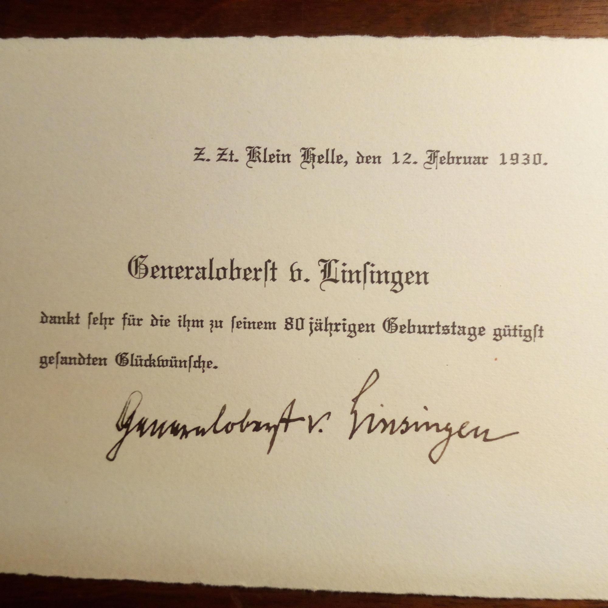 1850-1935, Generaloberst im 1. Weltkrieg - gedr. Geb.-Dankkarte, Klein-Helle (Mecklenb.) 12.1.1930, m. U.