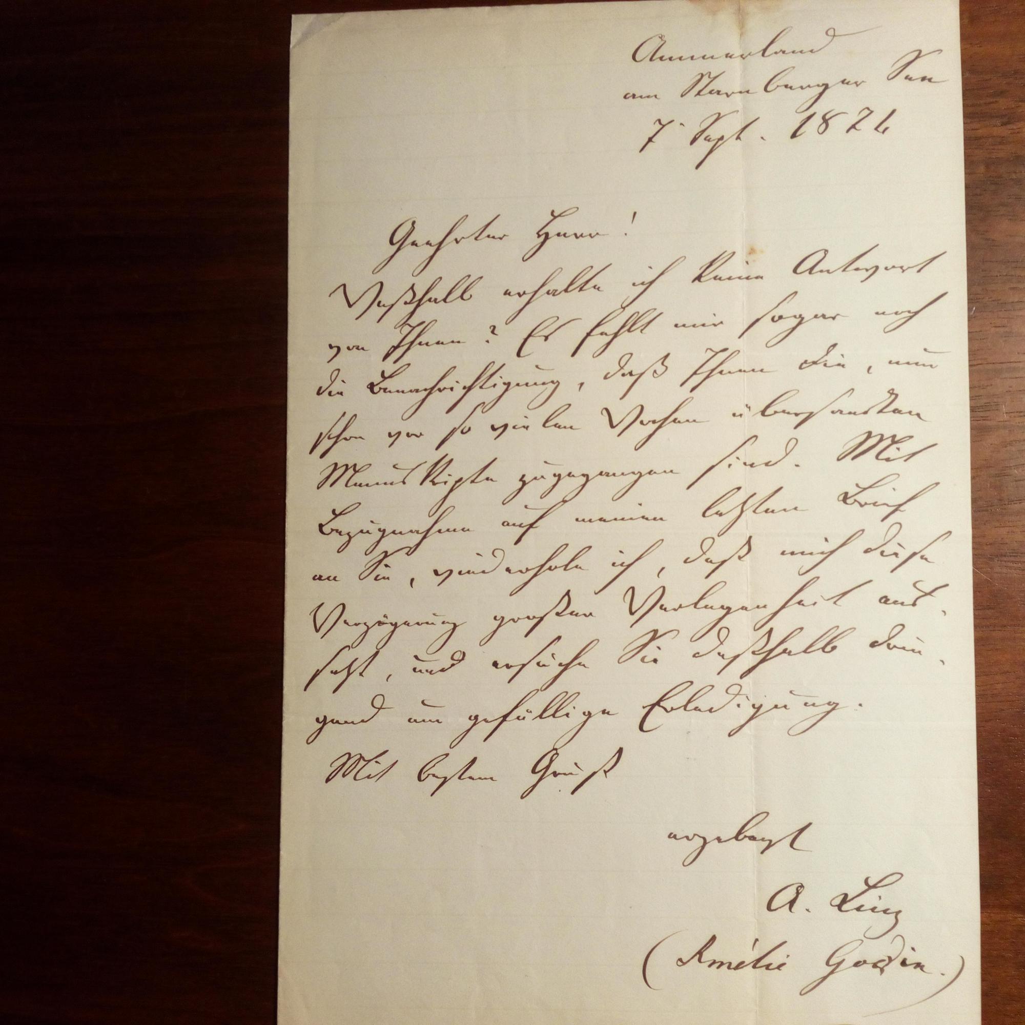 Pseud. Amélie Godin, 1824-1904, Schriftstellerin (Heyse-Kreis) - E. Br. m. U., Ammerland am Starnberger See 7.9.1874, 1 S. gr.8°, ger. Altersspuren. Fragt nach "nun schon vor so vielen Wochen übersandten Manuskripten ... daß mich diese Verzögerung großer Verlegenheit aussetzt...".