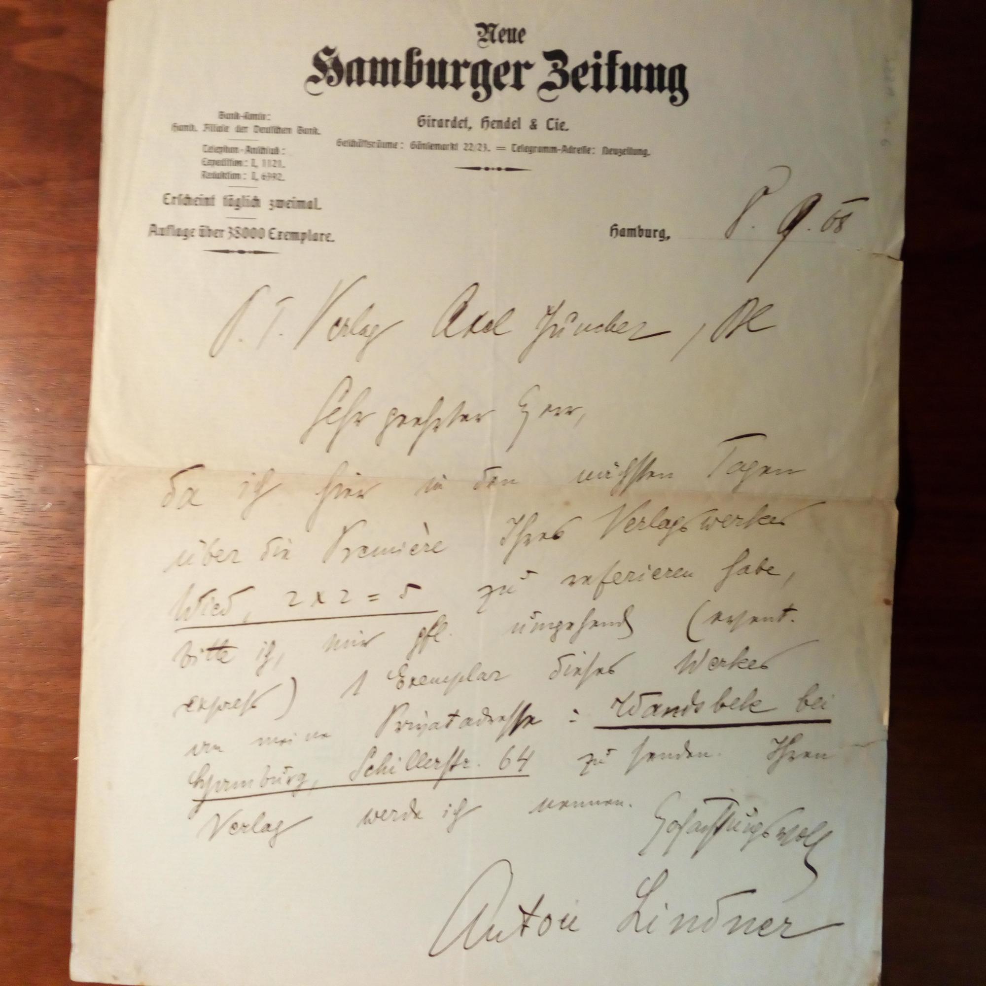 1874-1929, österr. Schriftsteller und Kritiker - E. Brief mit U., 8.9.1908, Briefkopf der "Hamburger Zeitung", ger. Alters-spuren. An den Verlag A. Juncker: Da er über "2x2=5" von Gustav Wied zu referieren habe, bittet er um ein Exermplar an seine Privatadresse.