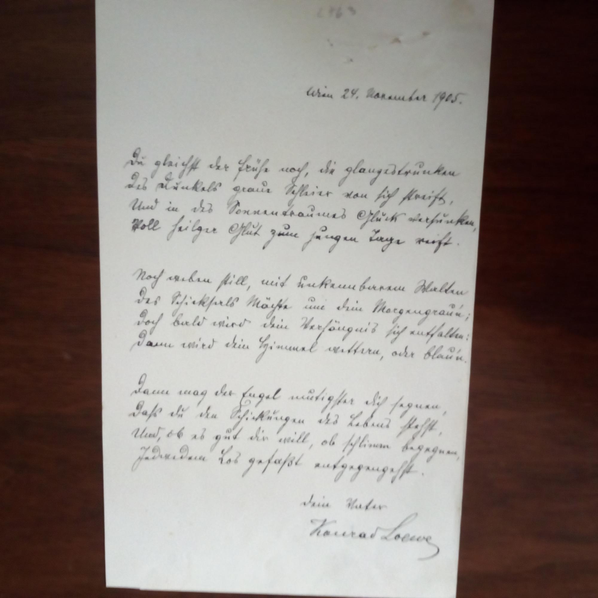 1856-1912, österr. Schauspieler - Schöner e. Brief in Gedichtform (3 Str. à 4 Zeilen) mit E. ("Dein Vater") und U., 1 S. 8°, Klammerspur. "Du gleichst der Frühe noch, die schlafestrunken/ des Dunkels graue Schleier von sich streift,/ Und in des Sonnentraumes Glück versunken...".
