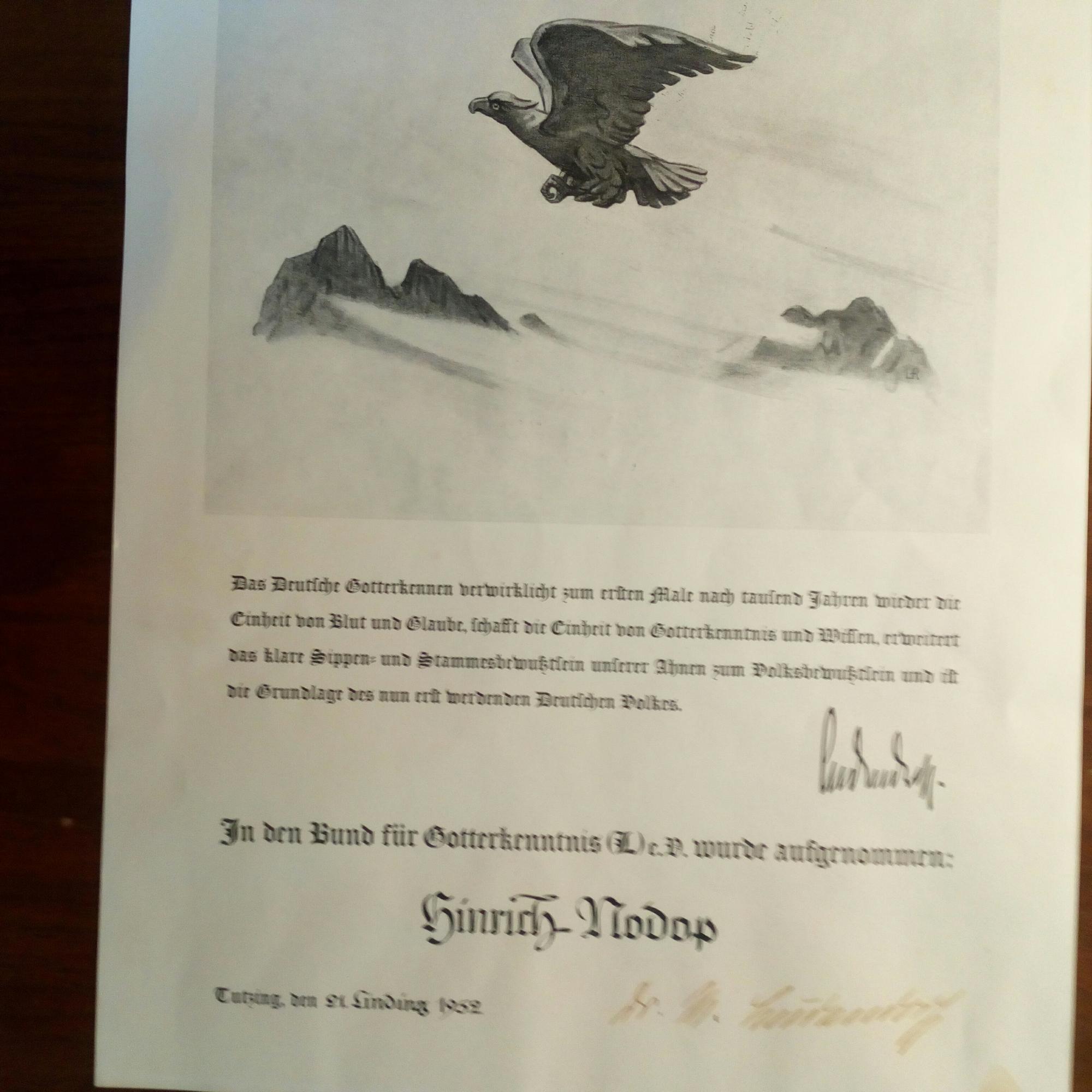 1877-1968, Witwe von Erich von L., deutschkirchl. Aktivistin - Urkunde mit U., Tutzing 21. "Linding" (Juni) 1952, 1 S. gr. folio. (mit Bild eines Adlers, und Zitat mit Faksimile-U. ihres Gatten). Der altmärk. Historiker Hinrich Nodop wird in den "Bund für Gotterkenntnis" aufgenommen. ...Das Deutsche Gotterkennen verwirklicht zum ersten Mal nach tausend Jahren wieder die Einheit von Blut und Glauben...