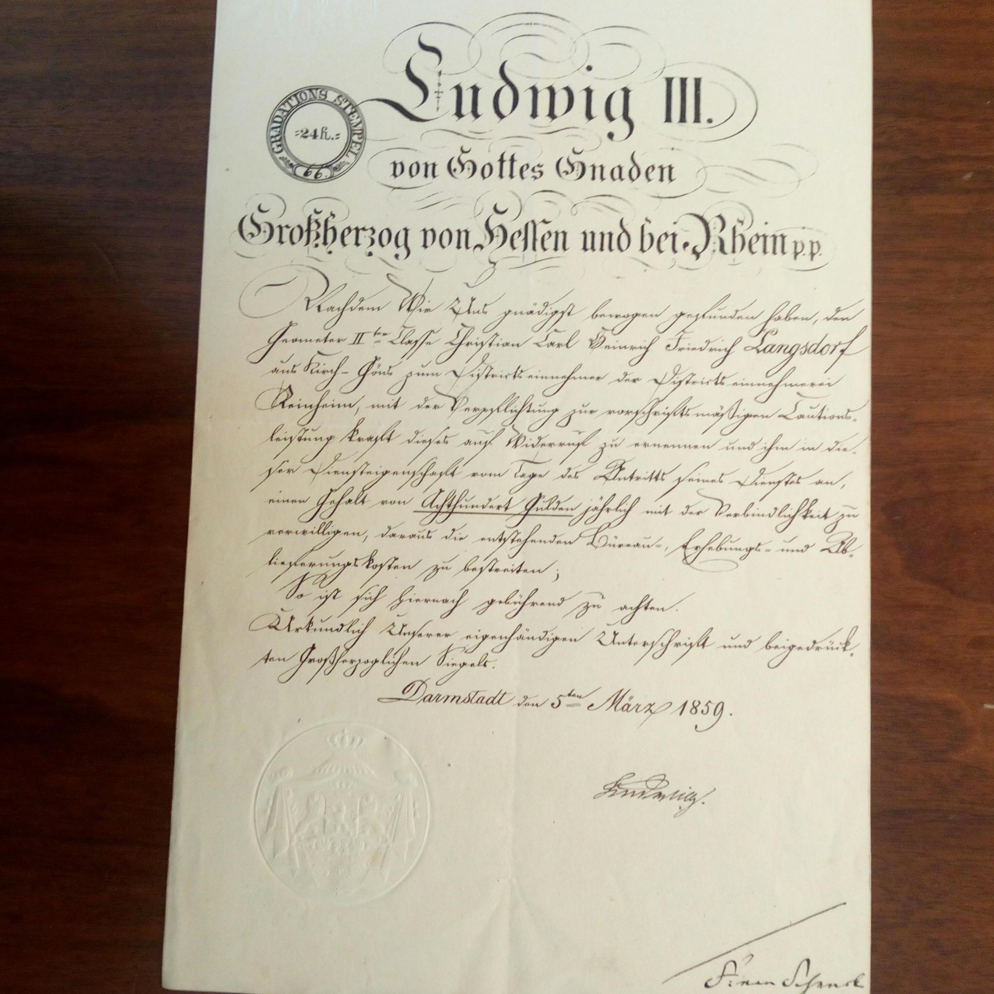 1848-77, Großherzog - Urkunde m. U., Gegenzeichn., Darmstadt 5.3.1859, 1 S. folio, 2 Blindstempel u. "Gradations-Stempel". Bestallung des "Distrikteinnehmers" von Reinheim. Beiliegen 8 alte Urkunden aus Reinheim.
