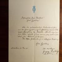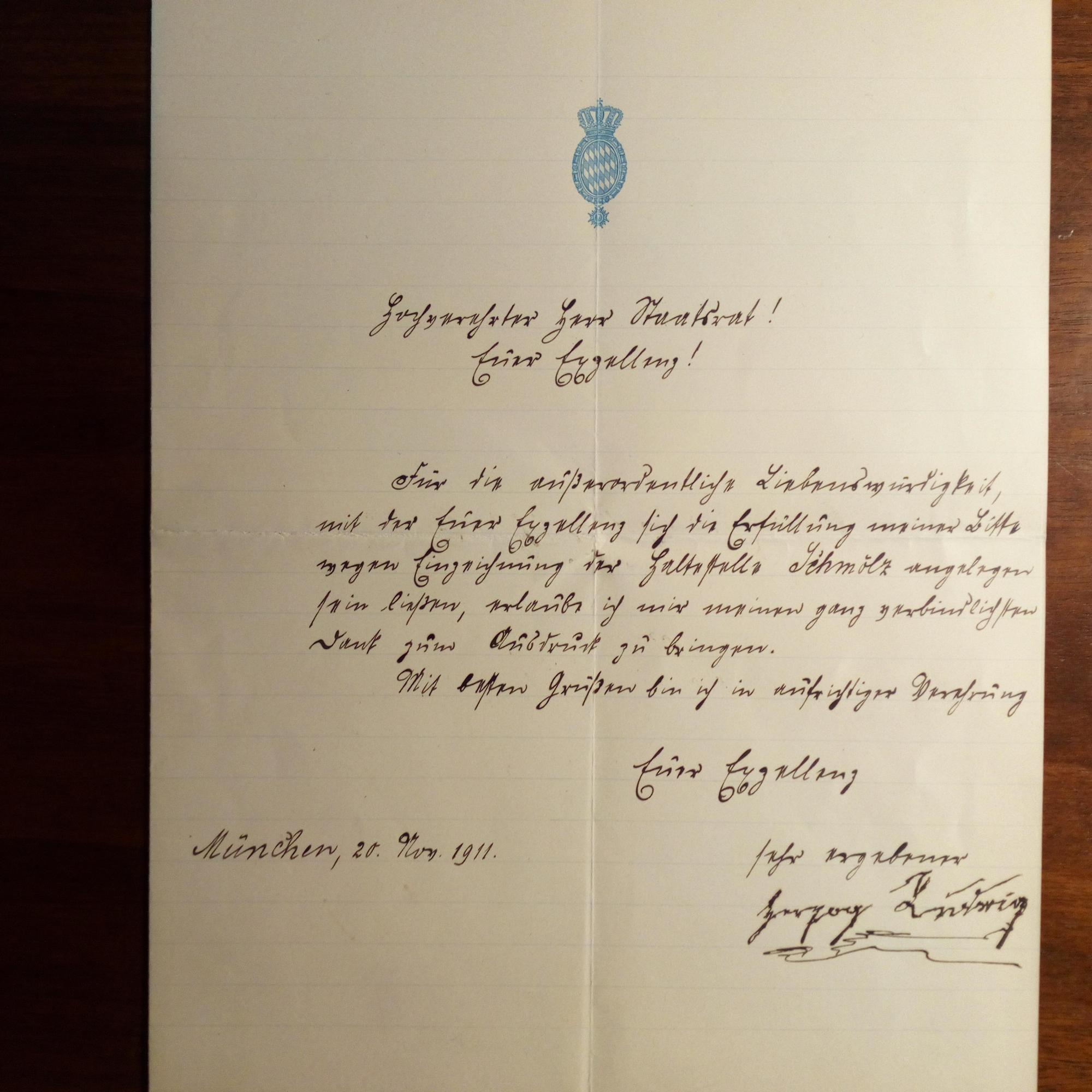"Herzog in Bayern", 1831-1920, General, Bruder. von "Sissi"- Br. m. U. (etw. zittrig), München 20.11.1911, 1 S. kl.4°, gedr. Wappen am Kopf. An einen Staatsrat: Dank ihm für "die Erfüllung meiner Bitte wegen Einzeichnung der Haltestelle Schmölz...".