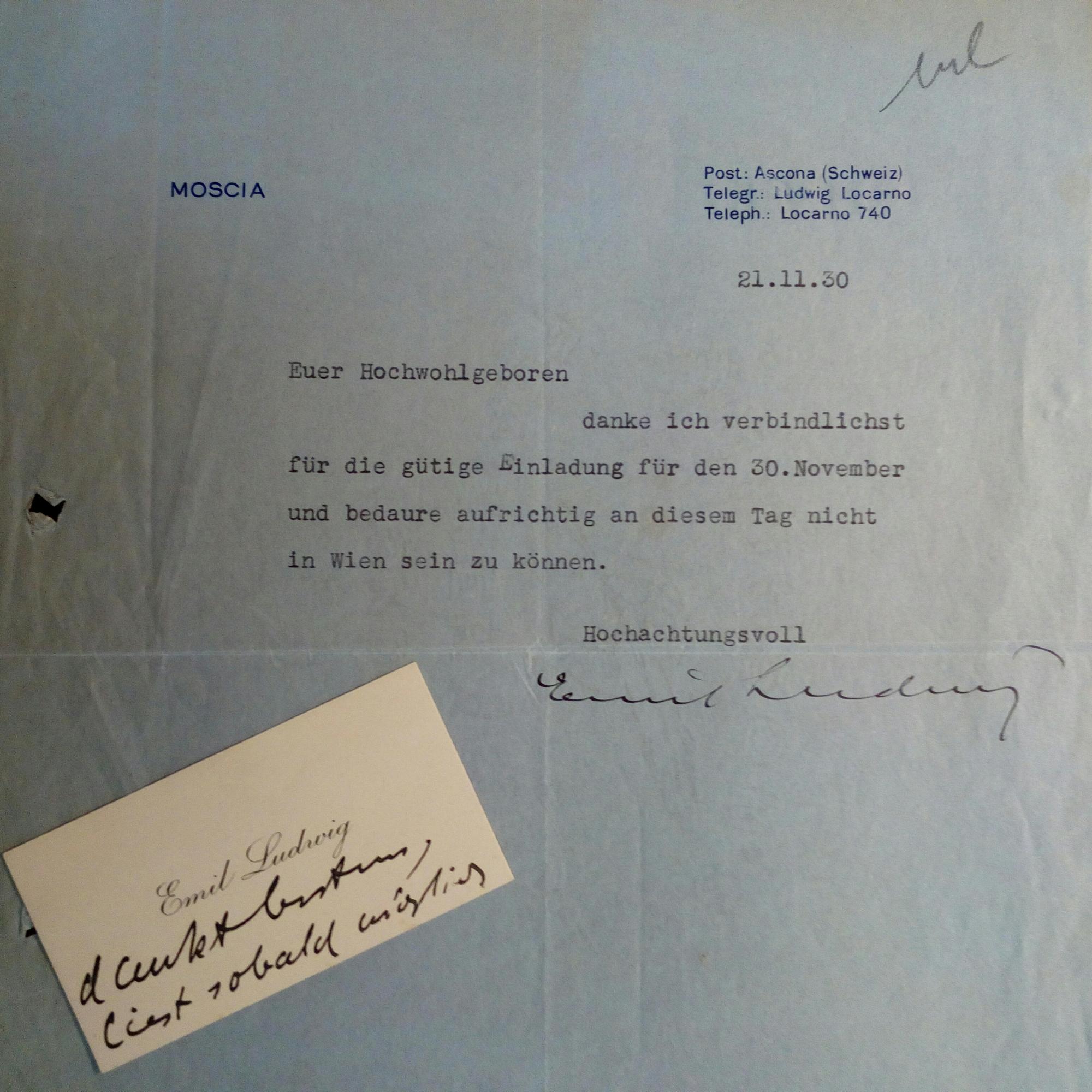 1881-1948, Schriftsteller - Brief mit U., (Moscia bei Ascona) 21.11.1930, Briefkopf, gel. Muss einer Einladung nach Wien absagen. Beiliegt Namenskärtchen mit e. Zeilen.