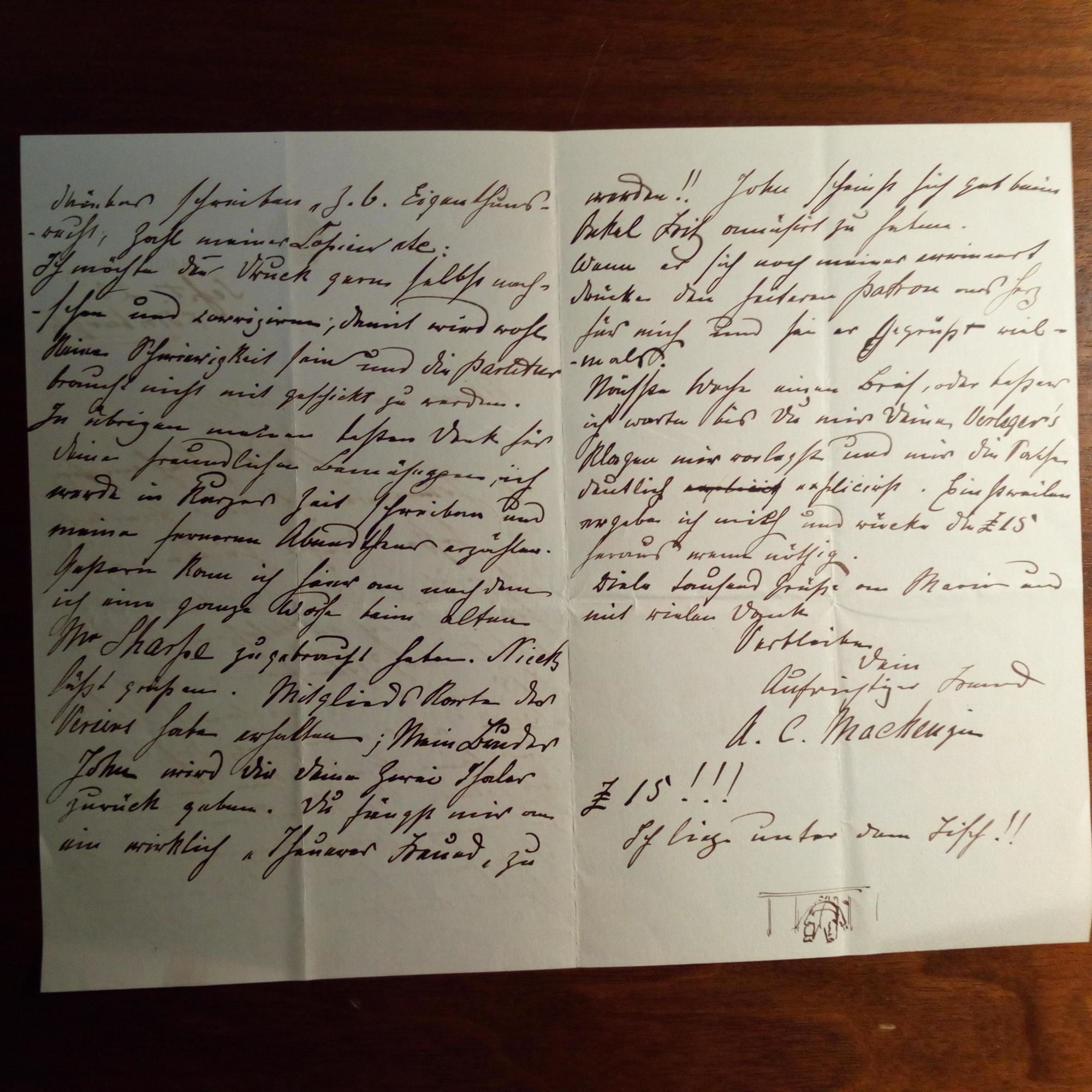 1847-1935, brit. Komponist - E. Br. m. U., Edinburgh, 3 S. 8°, dicht geschr., gedr. Monogramm. An "Günther" betr. einer Geldschuld ("£15!!! Ich liege unter dem Tisch!", dieses auch als witzige e. Zeichnung), Verlagsfragen, Freunde u.a.