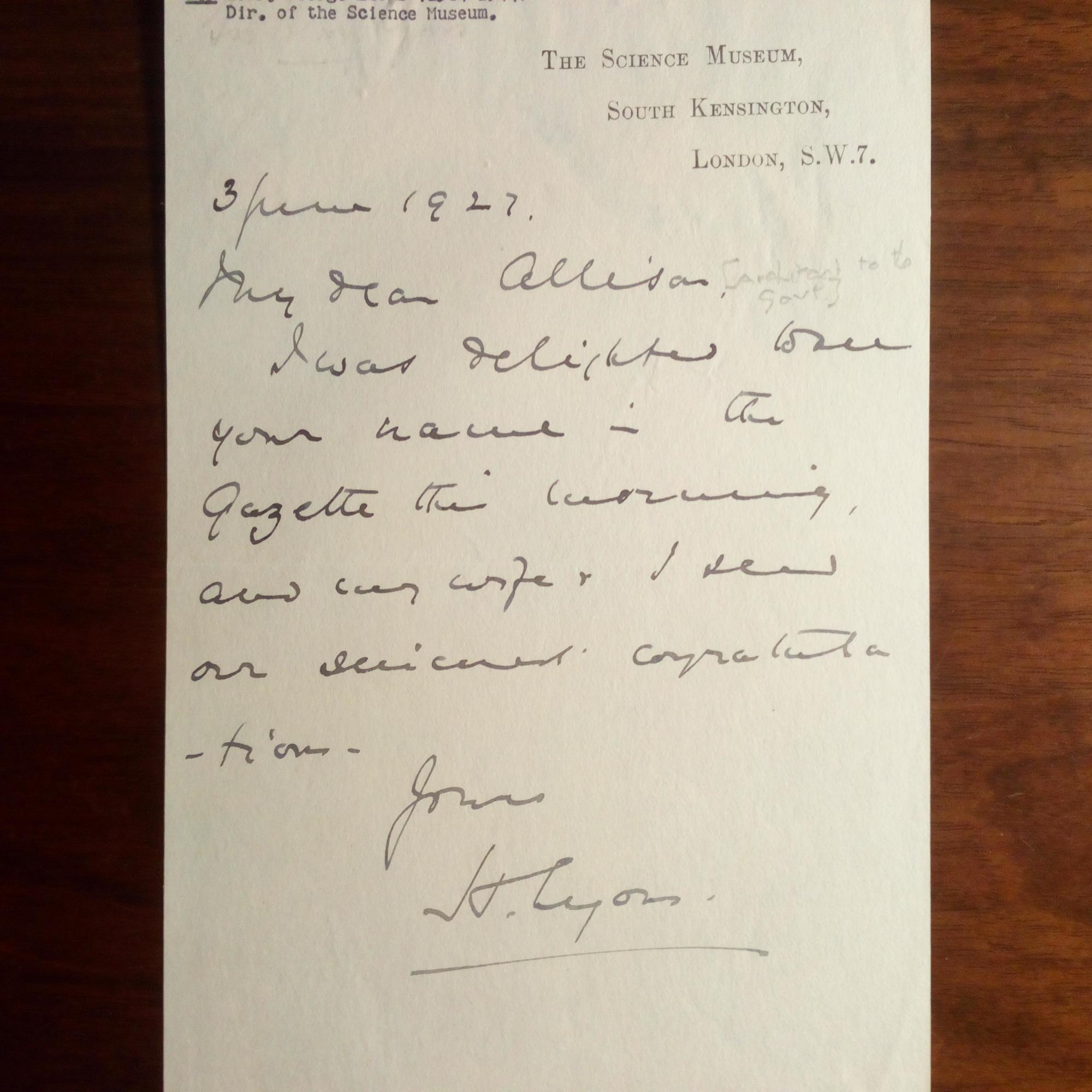 1864-1944, brit. Geologe - E. Br. m. U., 3.6.1927, 1 S. 8°, Br.kopf als Direktor des "Science Museums" in London, dessen Direktor er war. Gratuliert Hofarchitekt Richard Allison (1869-1958) zu einer Meldung in der "Gazette this morning".
