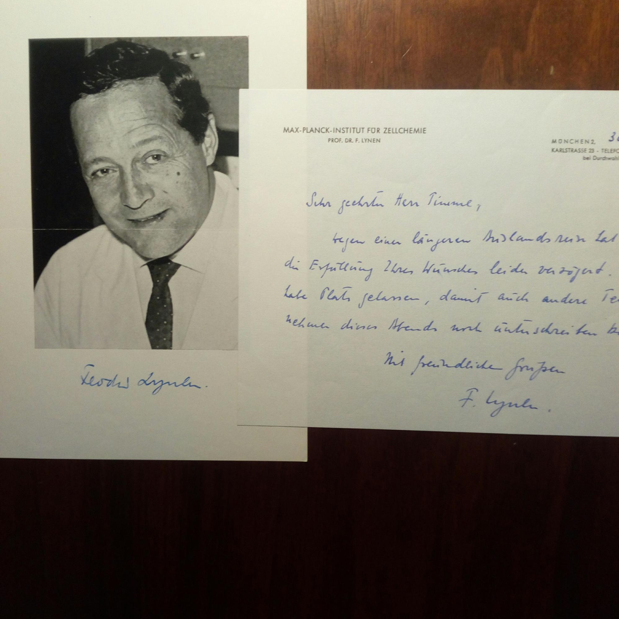 1911-79, Biochemiker - Pfo. (wohl aus einem Buch) mit U., gefaltet. Beiliegt e. Brief mit U., (München) 30.3.1972, 1 S. 8° quer, Br.kopf des Instituts für Zellchemie. An einen Sammler.