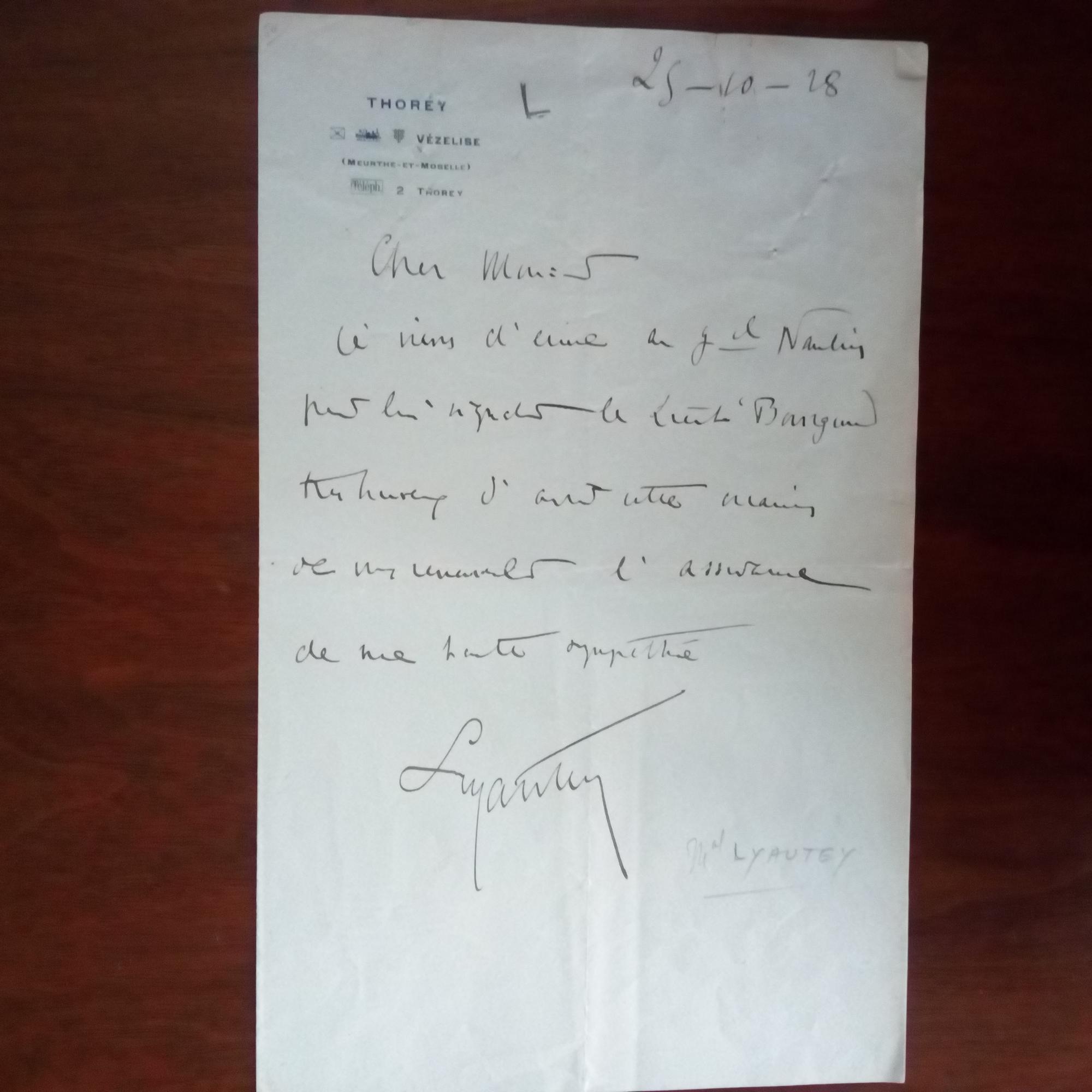 1854-1934, frz. Kolonial-Offizier, Politiker, u.a. Kriegsminister, "Marschall von Frankreich" - E. Kurzbrief mit U., Thorey 25.10.1928, ¾ S. gr.8°, Gebr.spuren. Er käme von General Naulin (Stanislaus, 1870-1932) und könne sich auf ihn verlassen.