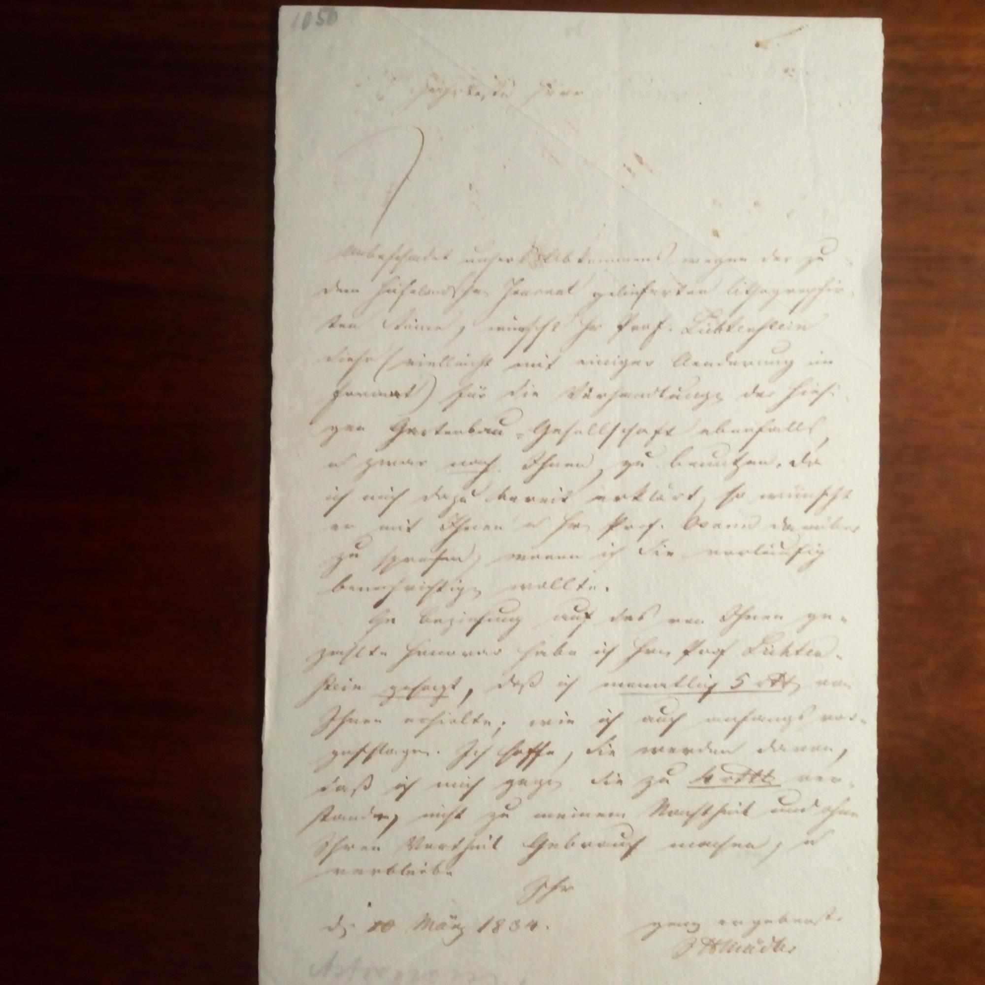 1794-1874, Astronom, später Dir. des Obser-vatoriums in Dorpat - E. Br. m. U., (Berlin) 20.3.1834, 1 S. kl. 8°, dicht beschr., kl. Gebr.spuren. An einen Herrn, der dem "Hufelandschen Journal" "lithografirte Steine" überlassen hatte. Prof. Lichtenstein (Martin Hinrich, 1780-1857, Zoologe) wolle diese nun auch für die "hiesige Gartenbau-Gesellschaft" mit entspr. Vergütung nutzen. Hofft, dass der Adressat davon "nicht zu meinem Nachtheil und ohne Ihren Vortheil Gebrauch" mache.
