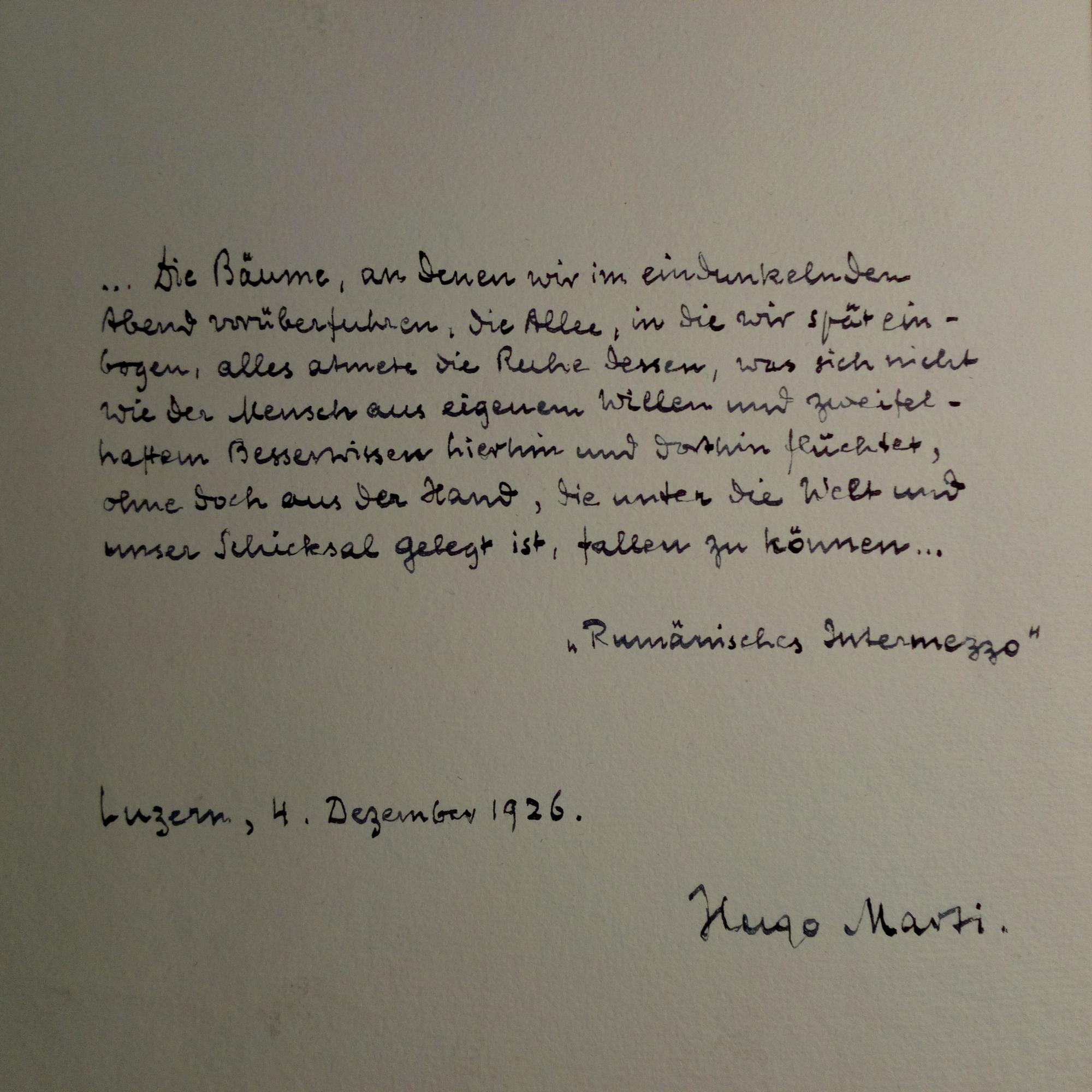 1893-1937, schweiz. Schriftst. - 4°-Blatt mit e. längerem Zitat (aus "Rumänisches Intermezzo") m. U., Luzern 4.12.1926, dekorativ.