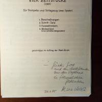 1934-2023, schweiz. Bratschist und Komponist - E. Widm. (...Günter Gross und den Musikfreunden aus dem Vogtland...) mit U. und D. 20.3.1985 auf Fotokopie der vollständ. Partitur seiner "Vier Zeitstücke. Für Trompete und Schlagzeug" 1982. Ger. Gebr.spuren.
