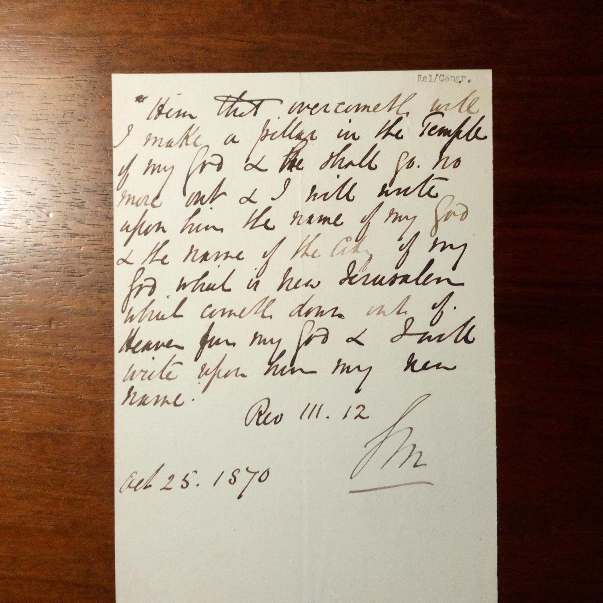 1817-78, engl. Prediger - E. längeres Zitat (über "New Jerusalem") mit U. und D. 25.10.1870, Mont.spuren auf Rückseite.