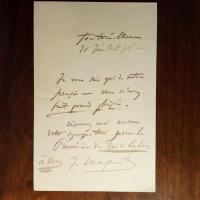 1842-1912, frz. Opern-Komponist - 1. E. Brief mit U., "toutailleur" 20.7.1876, 1 S. 8°. Freut sich, dass ihn die Adressatin zur Premiere seiner Oper "Le roi de Lahore" (am 18.7.1877) begleiten will. 2. E. Briefkarte mit U., Paris 1.11.1885, 2 S., Emblem am Kopf. Freut sich, dass die Adr. ihn zur Premiere seiner Oper "El Cid" begleiten will. 3. E. Brief mit U., 3 S. 8°. An eine "Madame": ...ma femme va me tenir compagné ce jour... Es werde deshalb ein "cours de feu" werden. 4. E. Brief mit U., Paris 8.2.1890, 3 S. 8°. An den Direktor der Oper von Lyon: ...je suis trop interessé par la représentation d'Esclarmonde (seine 1889 uraufgef. Oper) par votre beau théatre...je viendrai donc à Lyon por la "dernière" répetition avant la génerale... 5. Ähnlich, 18.6.1890. An einen dort. Mitarbeiter betr. Vorbereitung der Aufführung. 6. Kärtchen mit 2 e. Notenz. (2 Takte aus der Partitur der Oper "Werther" (Uraufführung 1892) mit U. ("M. Massenet"), "Wien!...". 7. E. Brief mit U., 2 S. 8°, mit e. Umschlag. Paris 8.6.1892. An Erzherzog Karl Ludwig von Österreich (1833-96, Bruder von Kaiser Franz Joseph I.): Bedankt sich für die bei seinem Wien-Aufenthalt bekommene "attention si charmante, si touchante...". 8. E. Brief mit U., Paris 20.4.1894, 1 ½ S. 8°. Dankt einem Freund für "votre excellente réponse que je viens de communiquer à Alphonse Daudet...". (seine Oper "Sappho" ist nach dessen gleichn. Roman geschrieben). 9. E. Brief mit U., 3 S. 8°, Pont de l'Arche (Normandie) 22.8.1895, 3 S. 8°. An den Schriftsteller und Librettisten Henri Cain (1857-1937): Hat den Brief des "brave ami Piffaretti" (Eugène, Gesangslehrer) erhalten ...c'est convenu - à moins que Mr Carvalho (Léon, Sänger, zeitw. Dir. des Théatre Lyrique) n'ait le projet de confier nos études à un autre chef du chant..., und Details zu einer geplanten Reise nach Dieppe. Freut sich, den Adr. wiederzusehen "et de causer de notre Cendrillon (am 24.5.1899 uraufgef. Oper). 10. E. Brief mit U., Paris 3.1.1899, 4 S. 8°. An einen Kollegen in Turin: Dankt ausführl. für die Mitteilung über Aufführung des "Roi de Lahore" am "Teatro Regio" in Turin (unter Carlo Pedrotti). ...la plus profonde joie!...le m'est une gloire d'être aussi patroné dans cette belle ville... Hofft, demnächst selbst kommen zu können. Beiliegen: 2 x dass. Pfo. und Visitenkarte mit e. Zusatz.