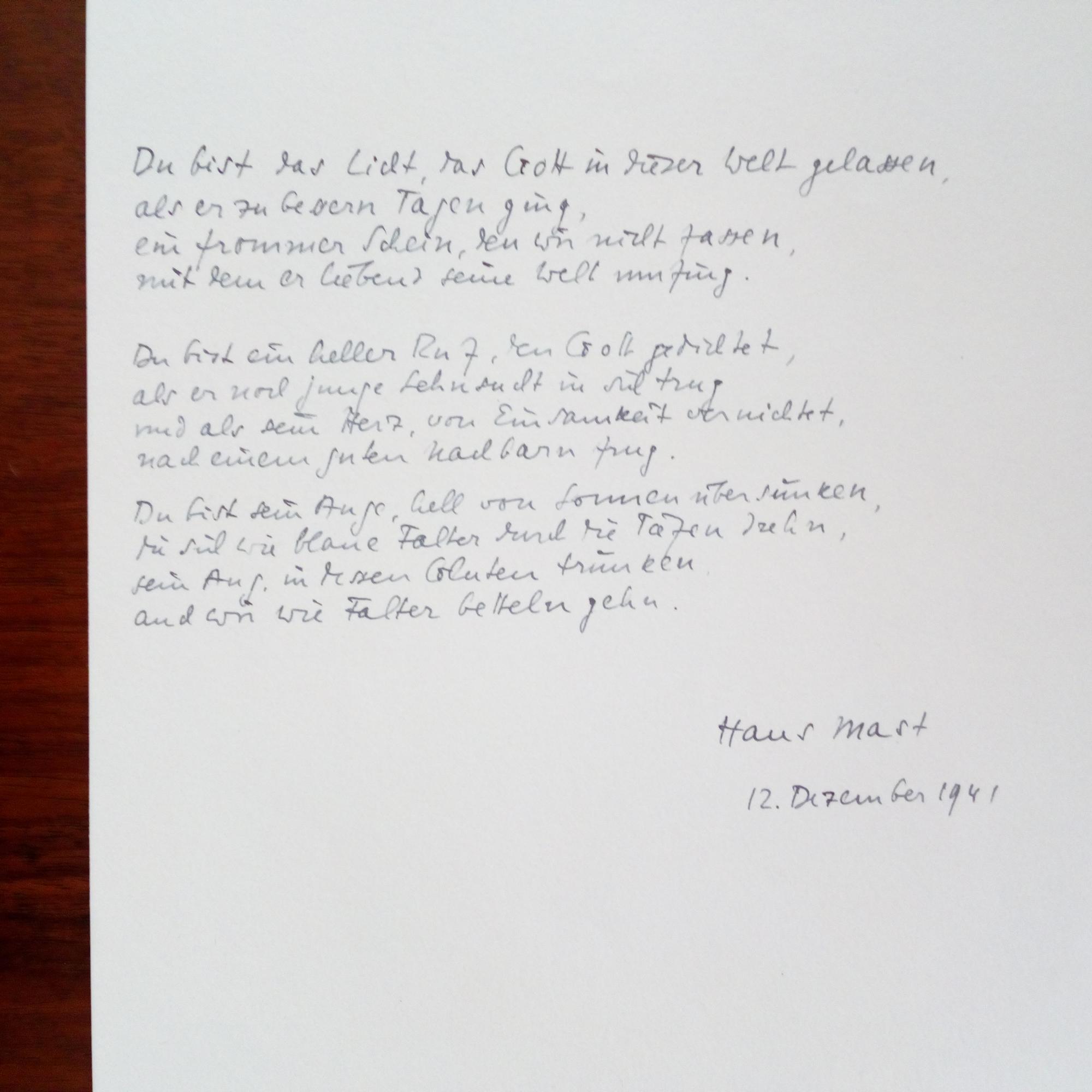 1902-64, schweiz. Schriftsteller - 4°-Blatt mit e. Gedicht ("Du bist das Licht, das Gott in dieser Welt gelassen,/ als er zu bessern Tagen ging...", 3 Str. à 4 Z.) mit U. und D. 12.12.1941.