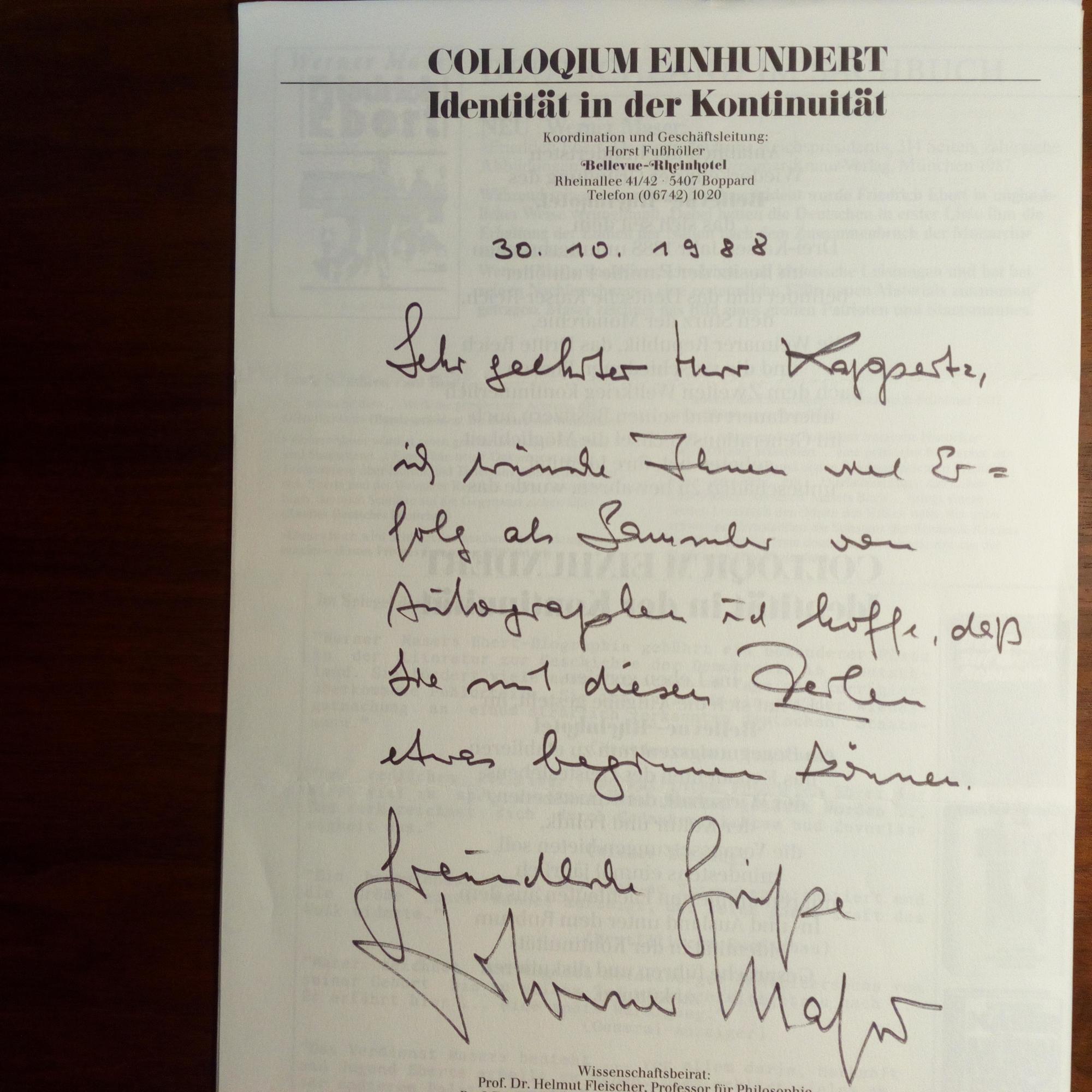 1922-2007, Historiker - 1 S. 4° aus einem e. Arbeits-manuskript (aus seiner Kohl-Biografie). Am Kopf e. beschriftet m. U. u. D. 29.6.1990. Mit e. Begleitbr. m. U., Br.kopf des "Colloquium 100" in Boppard. Dazu Pfo. m. U. u. D. auf Rücks. Mit postal. Umschlag.