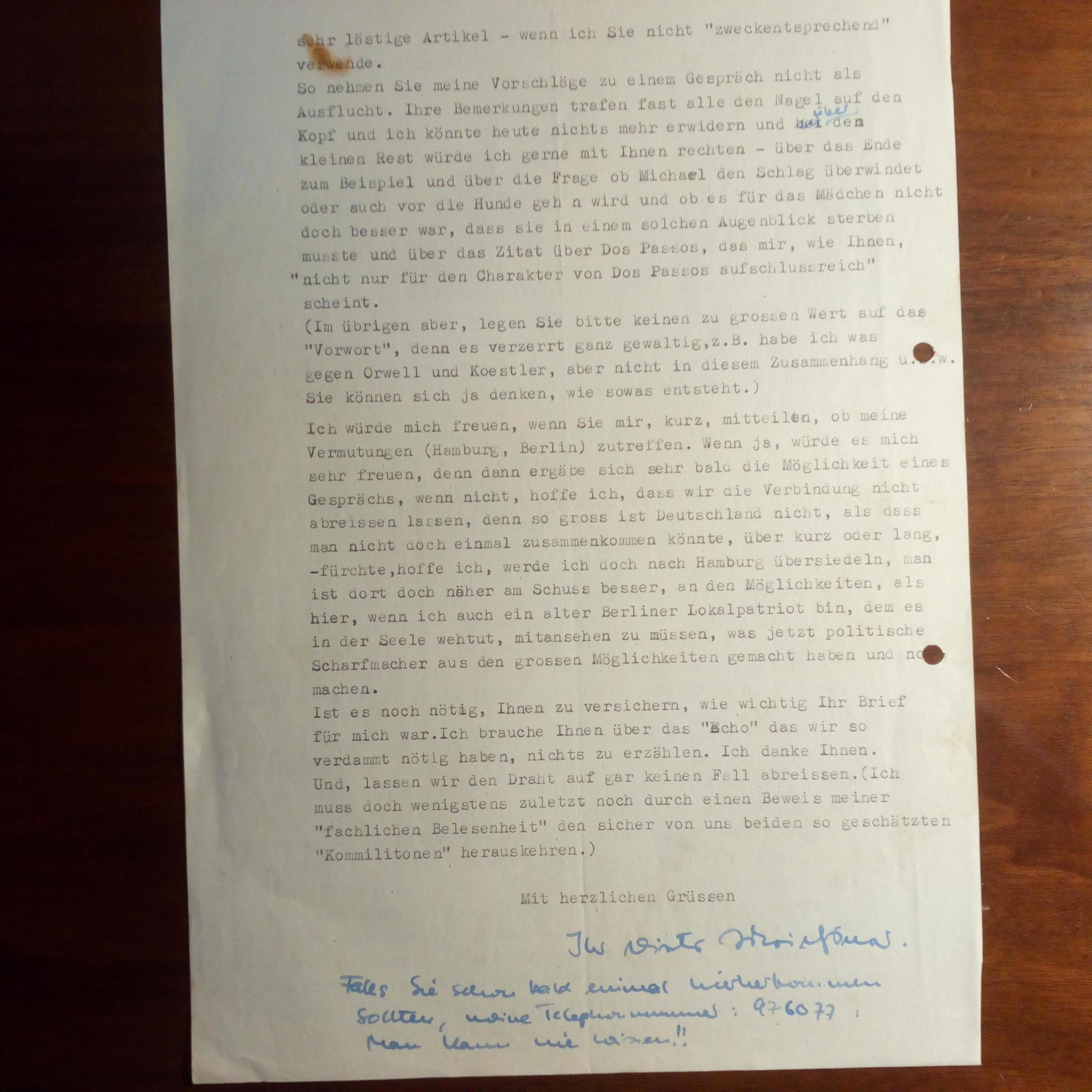 1928-2010, Schriftsteller und Dramaturg - Brief mit e. Zusatz und U., Berlin 20.9.1952, 2 S. 4°, dicht geschr., gel., kl. Gebr.spuren. Antwortet dem Lektor Gert Woerner in München auf einen kritischen Brief: ...erstens verstehen Sie was vom Geschäft und würden mich bald ertappen, wenn ich mich verstellte...z.B. habe ich was gegen Orwell und Koestler, aber nicht in diesem Zusammenhang...und über Zitate von Dos Passos...werde ich doch nach Hamburg übersiedeln, man ist dort näher am Schuss...