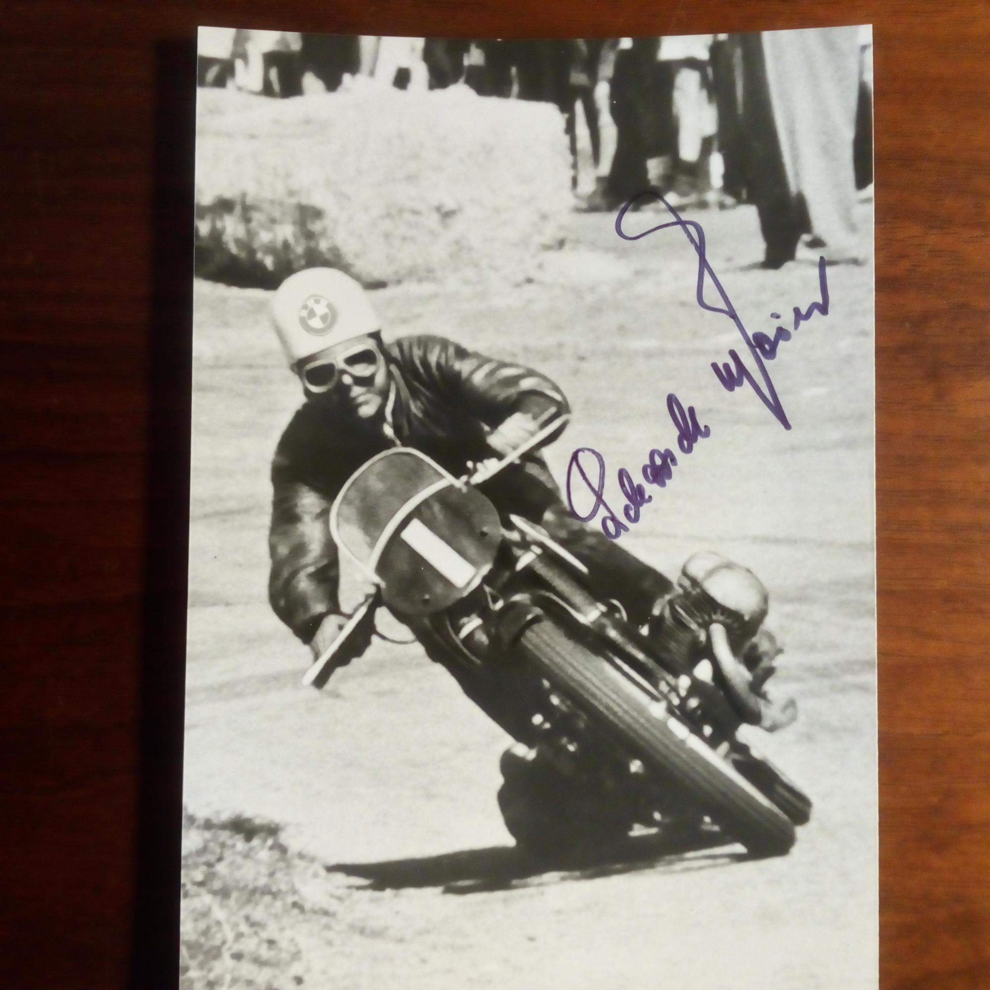 1910-99, Motorrad-Rennfahrer - Foto (Repro, beim Rennen) m. U., auf Rücks. Widm. u. weitere U., m. postal. Umschlag (Datum unleserlich, weitere U. im Abs.).