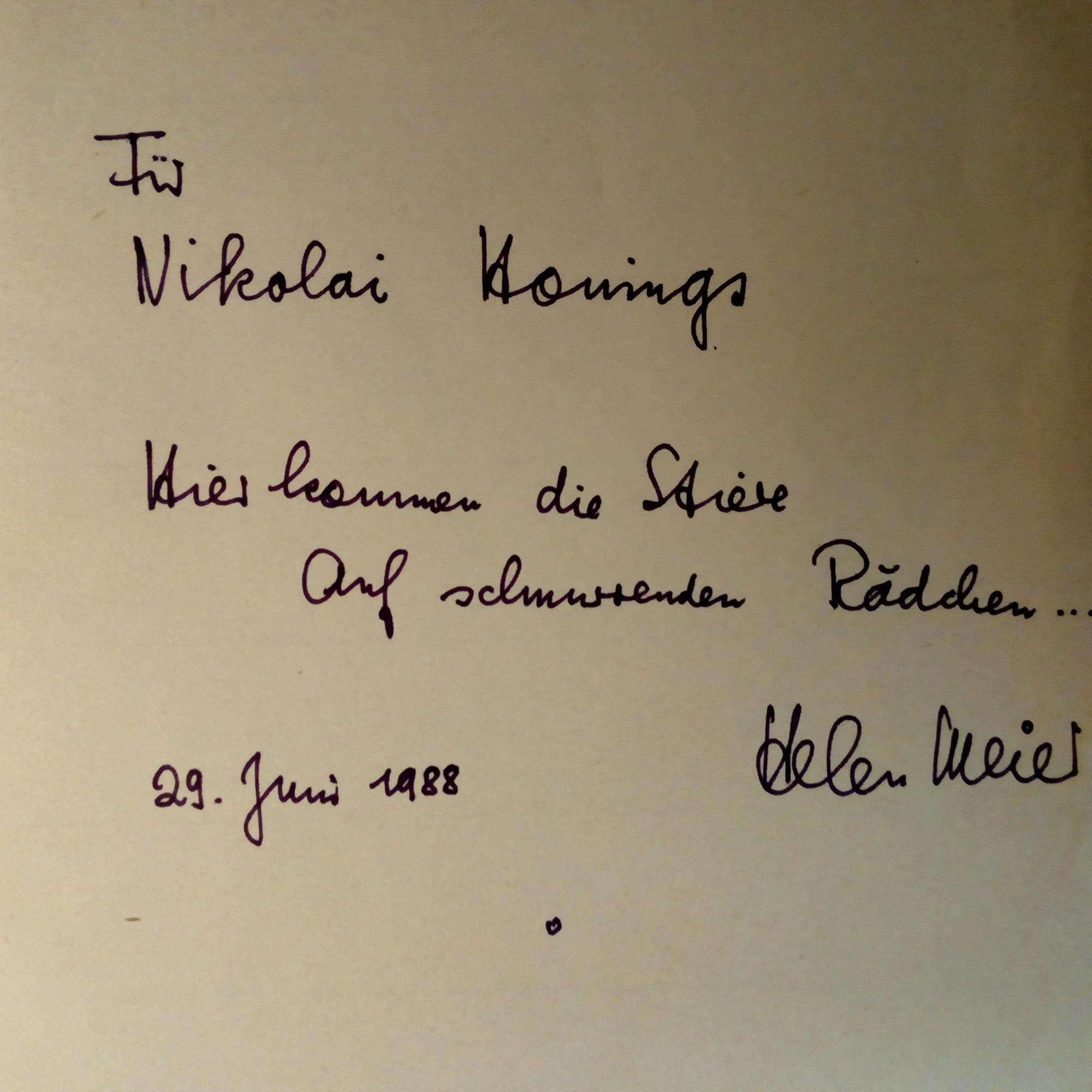 1929-2021, schweiz. Schriftstellerin - 8°-Blatt mit Widm. (für Nicolai Hennings) ...Hier kommen die Stiere/ Auf schnurrenden Rädchen... mit U. und D. 29.6.1988.