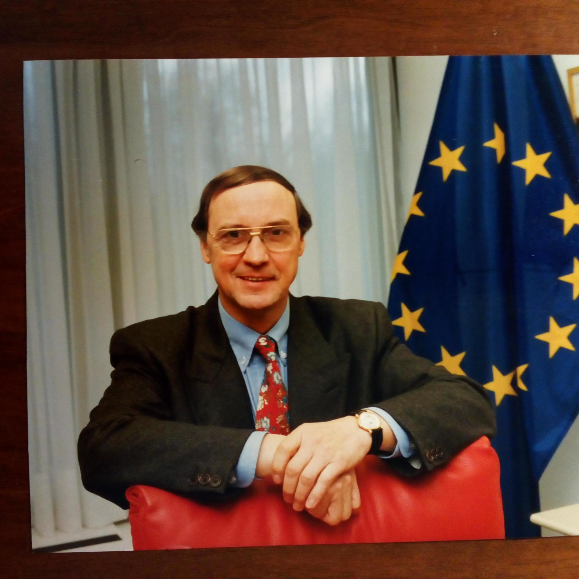 1942-2009, belg. Politiker - Farb-Pfo. (ca. 8° quer, vor Europa-Fahne). Auf Rücks. gedr. biograph. Hinweise u. U.
