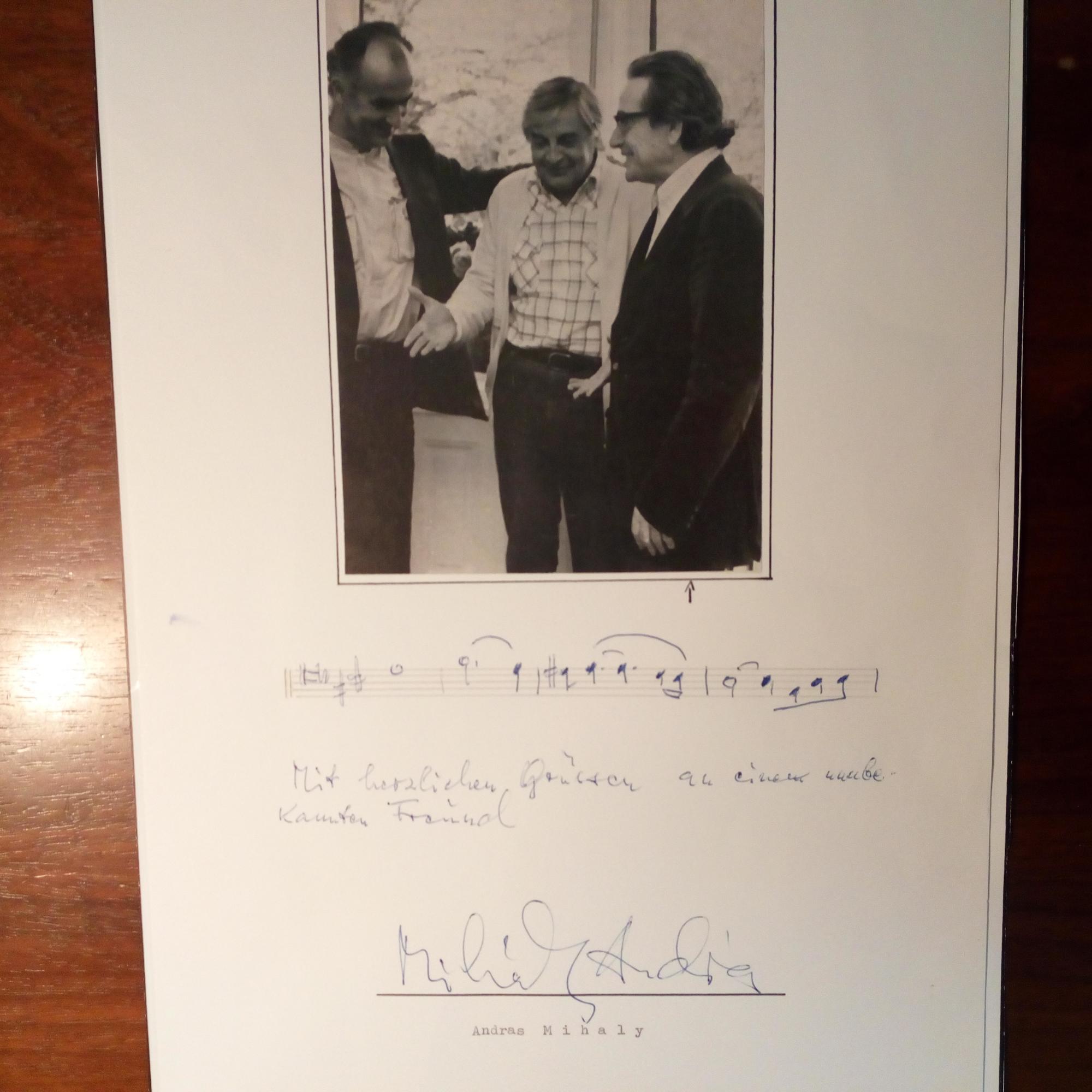 1917-93, ungar. Komponist - E. Notenzeile (4 Takte), Widm. "an einen unbekannten Freund" unter auf 4° mont. Zeitschriften-Foto (mit 2 weiteren Männern und e. Pfeil auf sich) mit U.