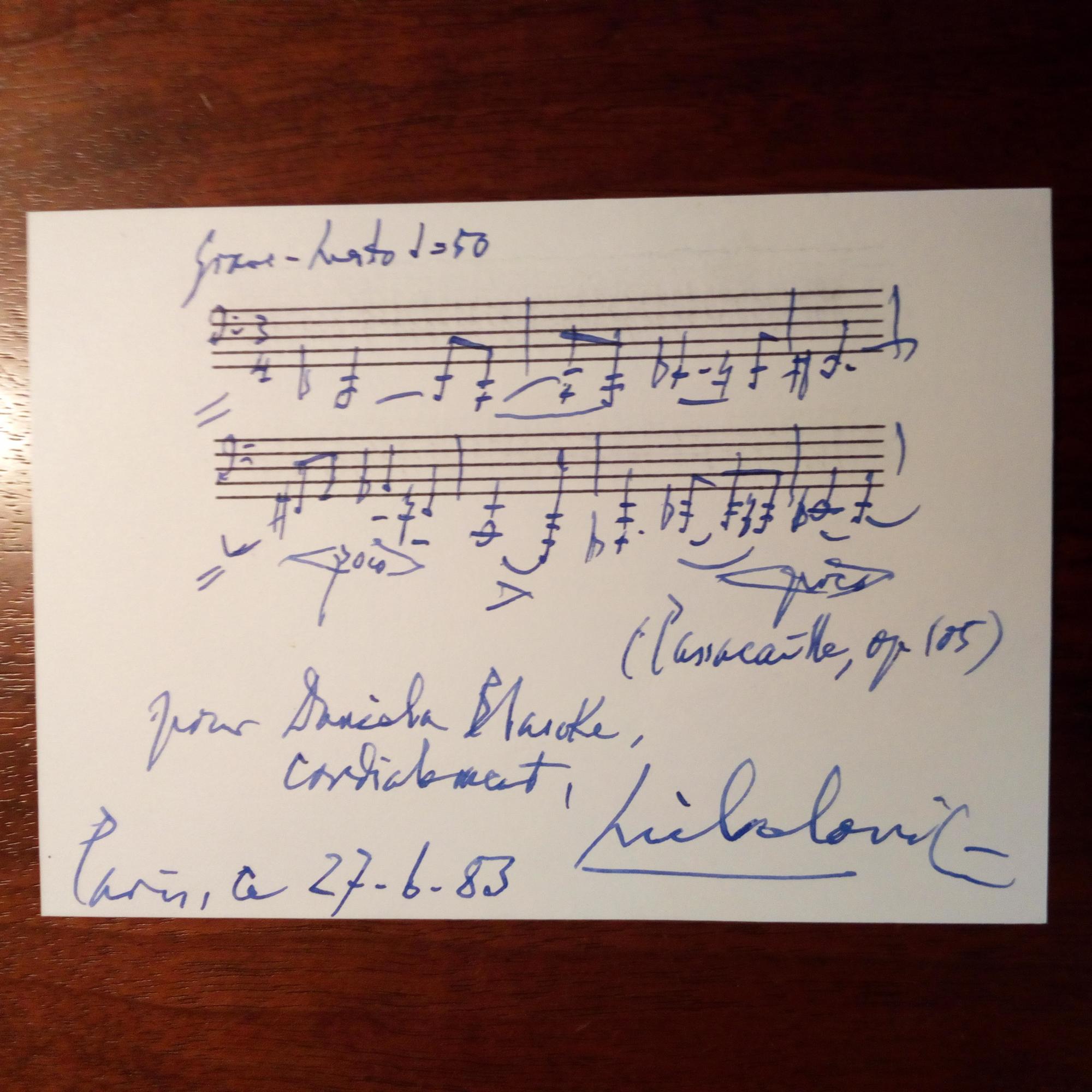 1908-86, rumän. Komponist - Karte mit 2 e. Notenzeilen ("Passacaille", 6 Takte), Widm. und U., Paris 21.6.1983.