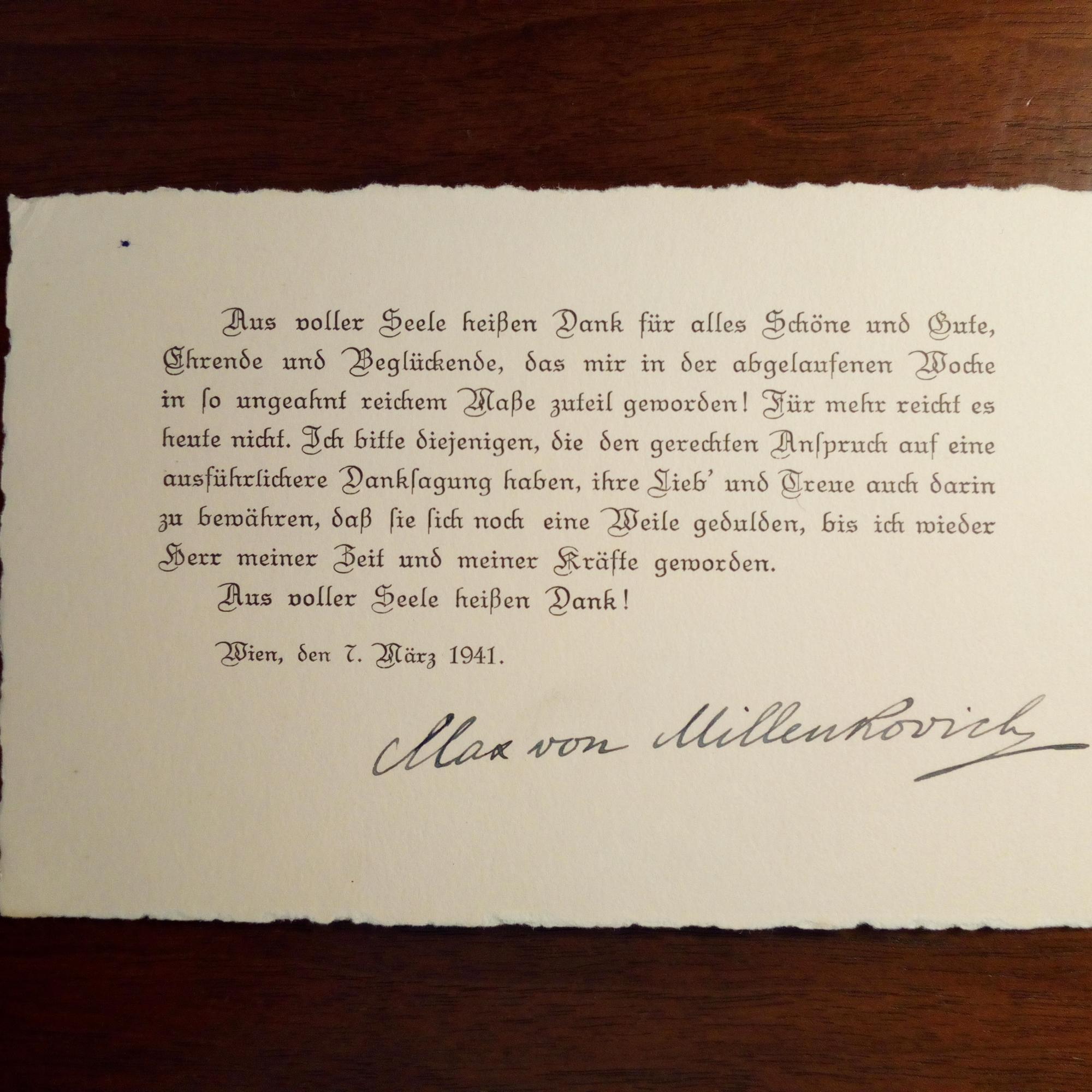 1866-1945, österr. Schriftsteller, Dir. des Burgtheaters - Gedr. Dankkarte (für Wünsche) m. U., Wien 7.3.1941.