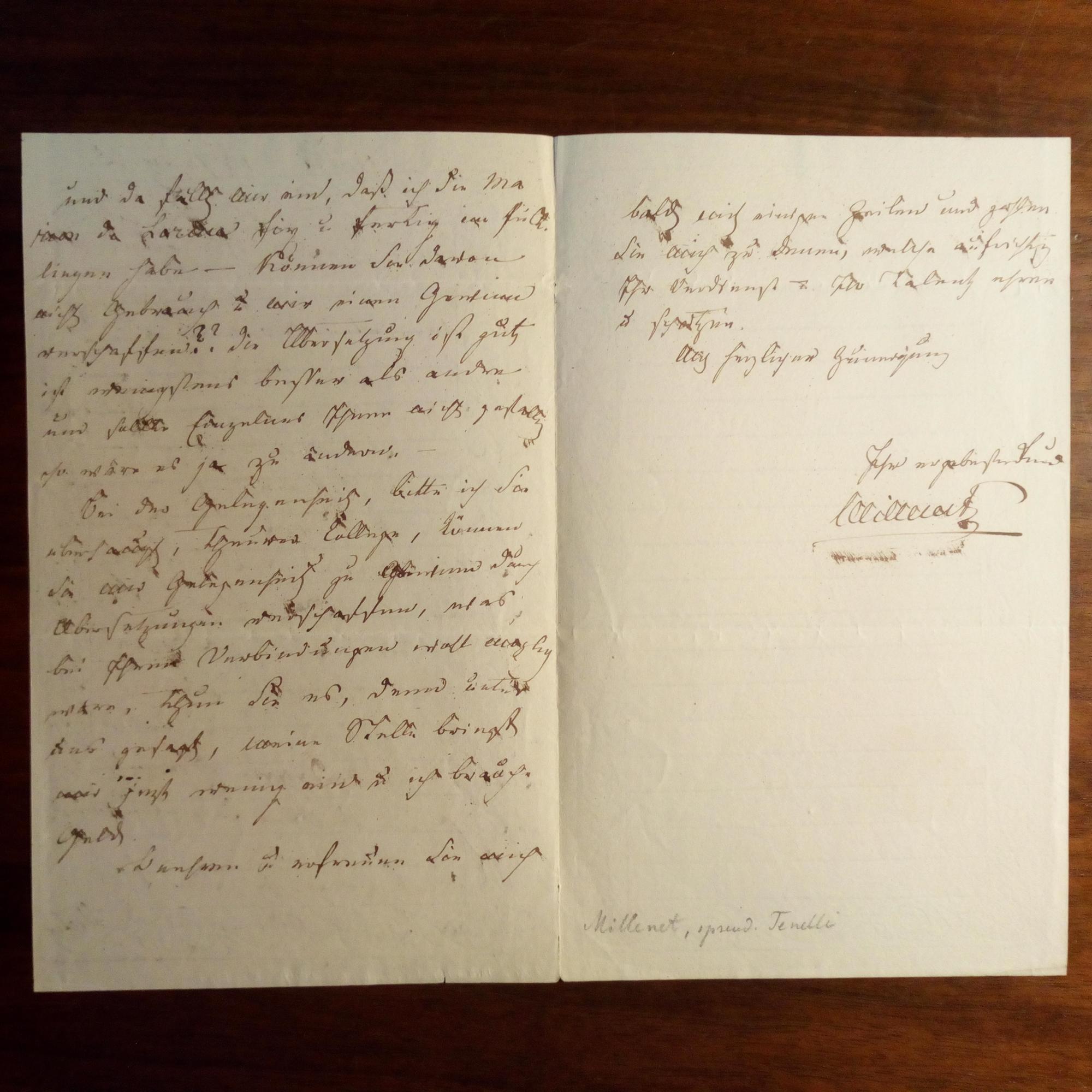 1785-1859, Schriftsteller ("Hoftheater-dichter") - E. Br. m. U., Gotha 4.6.1835, 2 ½ S. 8°, etw. tintenfleckig. Betr. Theaterstücken von ihm, u.a. "Marion da Lorina": ...die Übersetzung ist gut, ist wenigstens besser als andere und sollte Einzelnes Ihnen nicht gefallen, so wäre es ja zu ändern... Braucht dringend Geld.
