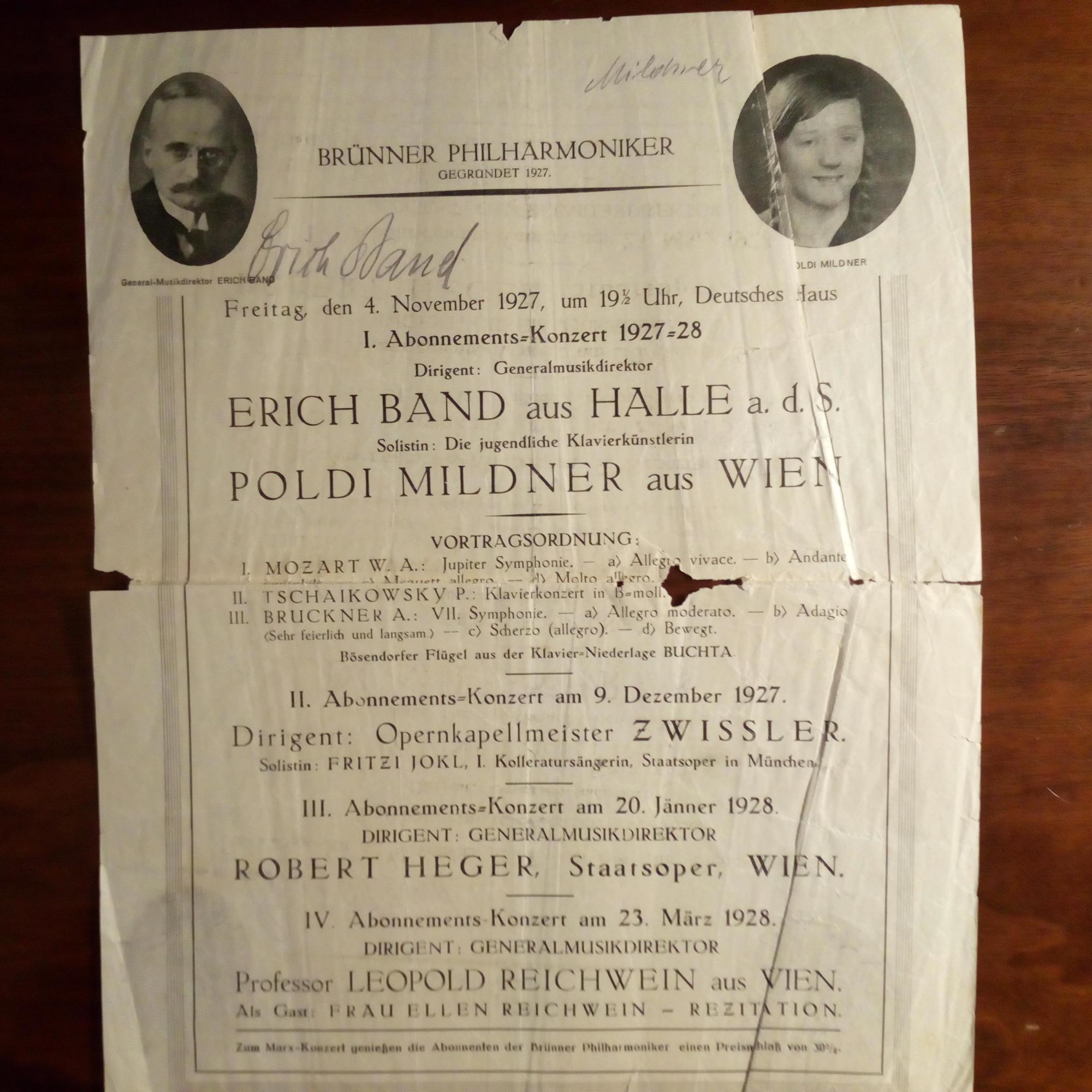 1915-2007, Pianistin, "Wunderkind" - Programmblatt der Brünner Philharmoniker vom 4.11.1927 m. U. (Tintenstift) neben Pfo. Ebenso von Musikdirektor Erich Band (1876-1945). Altersspuren.