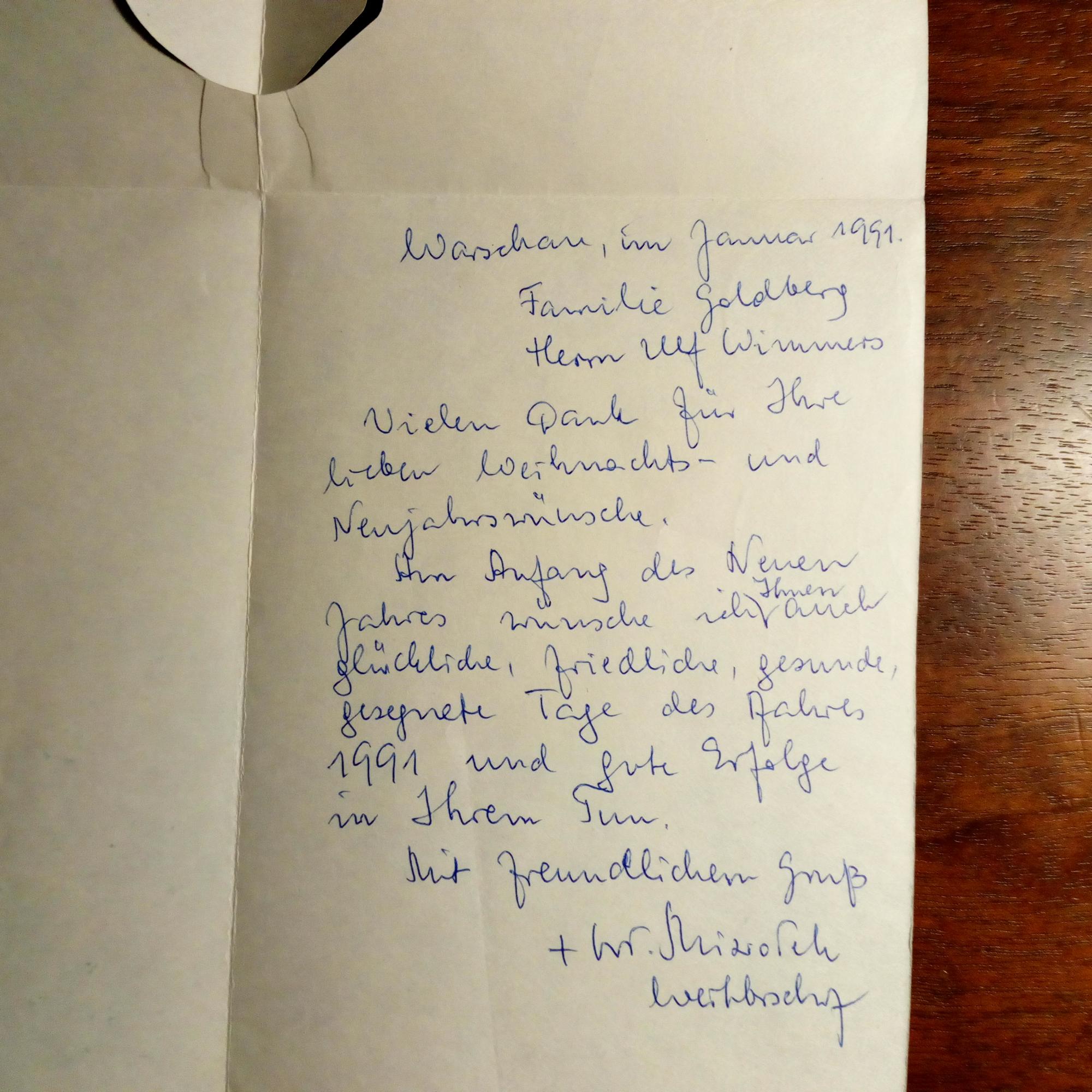 1914-2000, Bischof von Warschau - originelle Weihnachtsklappkarte. Auf Rückseite e. Br. m. U., Warschau Januar 1991, m. postal. Umschlag. An den Pfarrer und Historiker Eckhard Goldberg mit Familie in Mönchengladbach: Erwidert Neujahrswünsche.