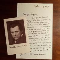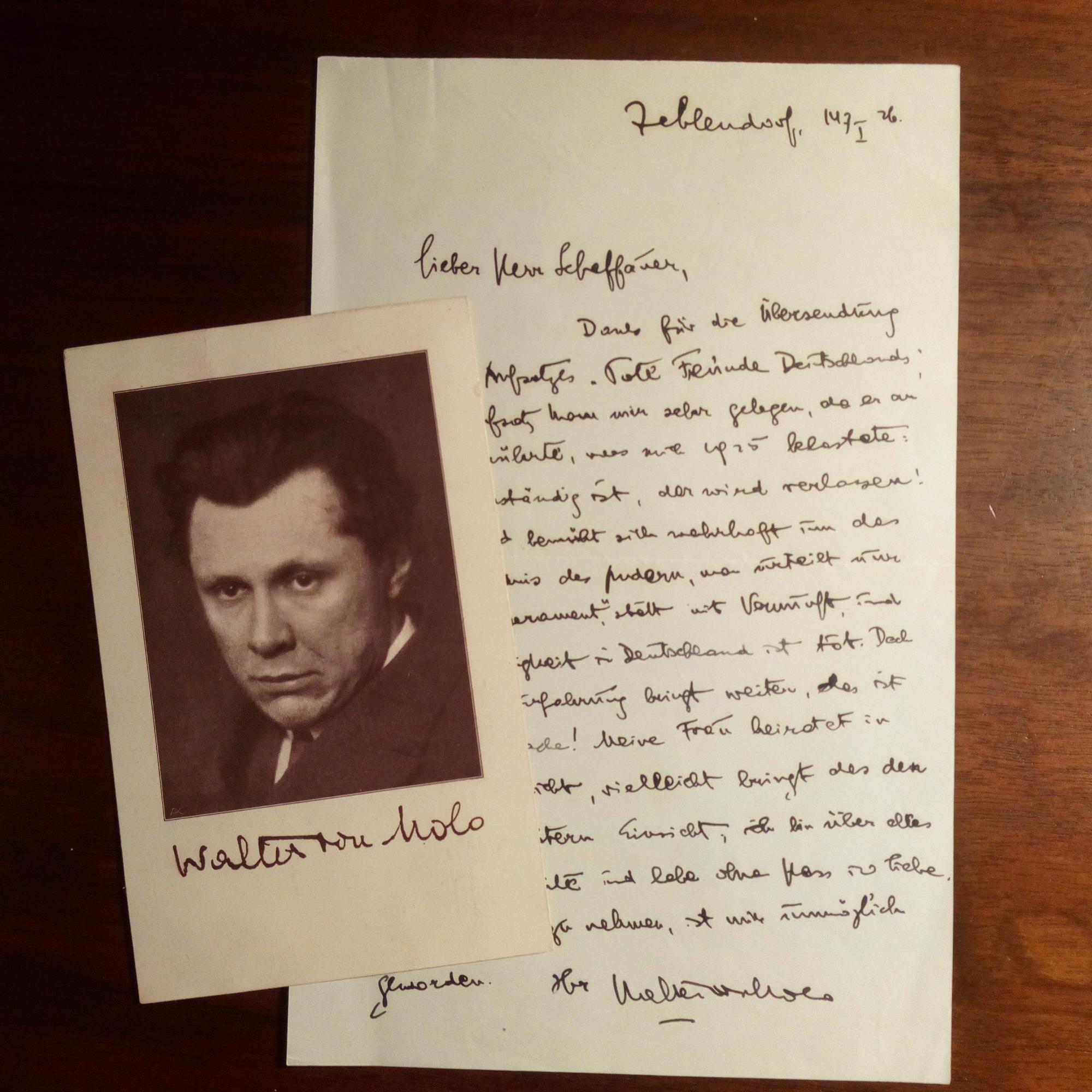 1880-1958, Schriftsteller - 1. E. Brief mit U., Wien 14.3.1910, 1 S. 8°. Bietet einem Verleger sein Drama "Inhaltsucher" an: ... mein Roman u. Novellenverleger...hat für kritische Arbeiten kein Interesse, daher dachte ich als Frieberger-Freund und Norde, nach meinem mütterlichen Blut, in erster Linie an Sie... 2. E. postal. Postkarte mit U., "Z. Zt. Kärnten, in den Bergen" 20.6.1924. An den Märchenforscher Adolf Thimme (1857-1945) in Göttingen: ...will gern im Herbst oder Winter aus meinen Werken vorlesen... 3. 2 e. Briefe mit U., Zehlendorf Jan.1926, zus. 2 S. 8°, je mit e. postal. Umschlag. An Schriftsteller Hermann George Scheffauer (1878-1927) in Berlin: ...bei der General-Versammlung des P.E.N. Club glaubte ich, Sie zu treffen...Ich schwieg über das alles bis heute aus Absicht, das Resultat ist die völlige Rückkehr meiner Kinder zu mir...die Erkenntnis der letzten sehr harten Jahre, und ein leises Lächeln über alles... 4. Brief mit U., 14.1.1930, 1 S. 8°quer. An eine Buchhandlung in Göttingen: Möchte vom Bahnhof abgeholt werden. 5. Brief mit U. ("Ihr 'lüsterner' Molo"), 16.11.1933, ¾ S. 4°. An den Kollegen Börries von Münchhausen (1874-1945): ...Es weiß ja jeder, dass Sie immer recht haben wollen und sich, im Gegensatz zu den erhabendsten Vorbildern, als Dichter für einen objektiven Kritiker halten... Erw. Edschmid und Ewers. 6. Brief mit e. Korrektur und U., Murnau 19.7.1944, 1 S. 4°, dicht geschr., ger. Gebr.spuren. An den Münchner Verleger Hanns Arens (1901-83) betr. geplanter Anthologie "Kleine Herrlinger Bücherei": ...dass bei den Soldaten grosse Sehnsucht nach geschmackvoller Innerlichkeit ist... 7. 2 Briefe mit U., März und Juli 1956. An die "Fundgrube" in Heidelberg betr. des Manuskripts "Lob der Eisenbahn": ...daß der Mann, der das Manuskript zu bearbeiten hatte, ein typischer bürokratischer Trottel ist, der für Humor keinen Sinn hat... Beiliegen: E. postal. Postkarte (Murnau 1946): Dankt für Wünsche, Pfo. mit U. und D. 1913 auf Rückseite, Porträt (nach Büste) mit e. Zitat, U. und D. 1917, späteres Pfo. mit E. und U., 4 x e. Zitate mit U. und D. (eines mit e. postal. Umschlag), Titelblatt des Romans "Der gezähmte Eros" mit Widm. für Kollegen Wolfgang Schumann (1887-1964), Wien 1911, und Blatt mit U. und D. (zus. 19 Autogr.). Dazu postal. Postkarte mit Grüßen mit U. von 7 seiner Freunde an ihn.