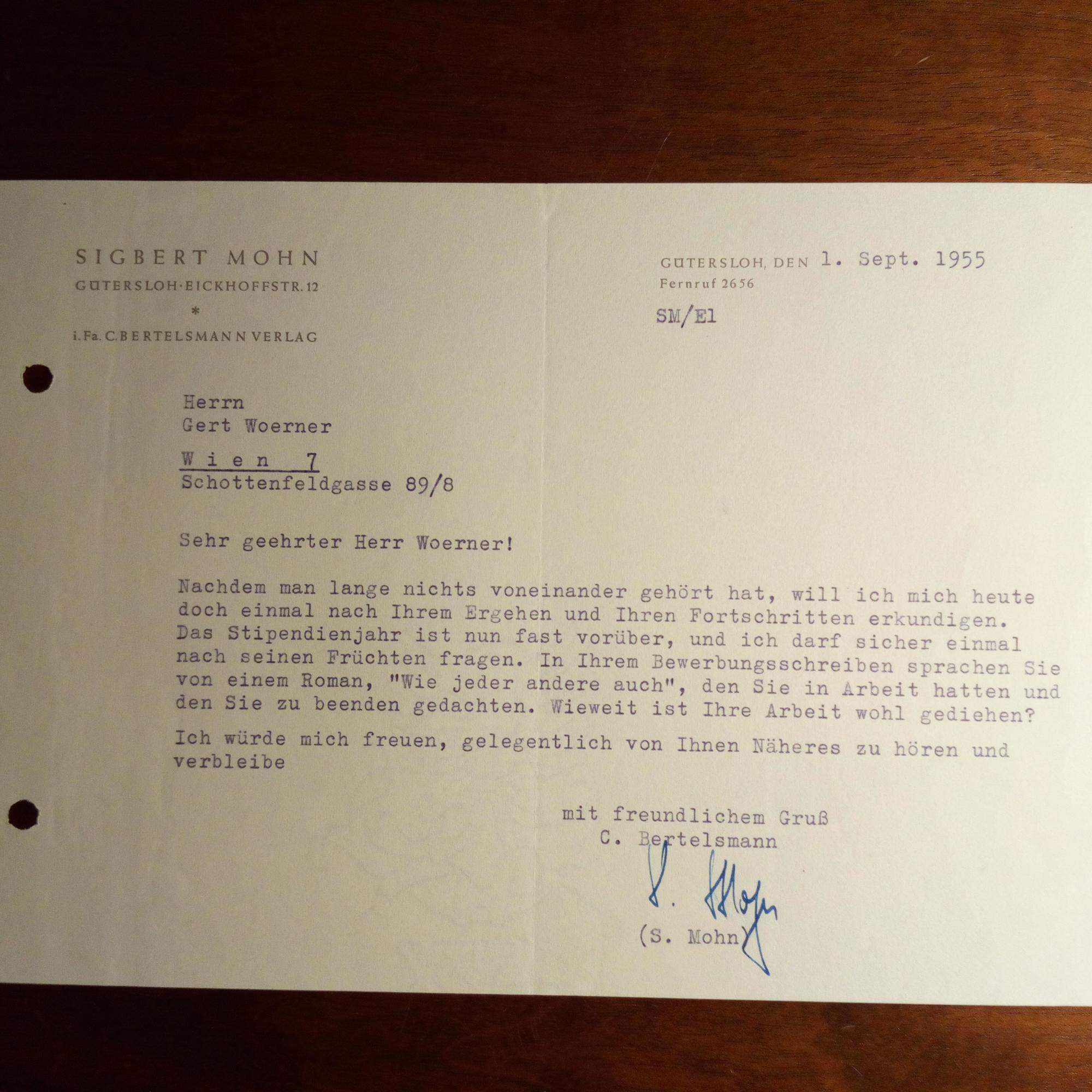 1918-2002, Verleger - Br. m. U., (Gütersloh) 1.9.1955, 1 S. 8°quer, Br.kopf, gel. An den Publizisten und Sachbuch-Autor Gert Woerner in Wien: ...Das Stipendienjahr ist nun fast vorüber, und ich darf sicher einmal nach seinen Früchten fragen ... sprachen Sie von einem Roman, "Wie jeder andere auch", den Sie in Arbeit hatten...