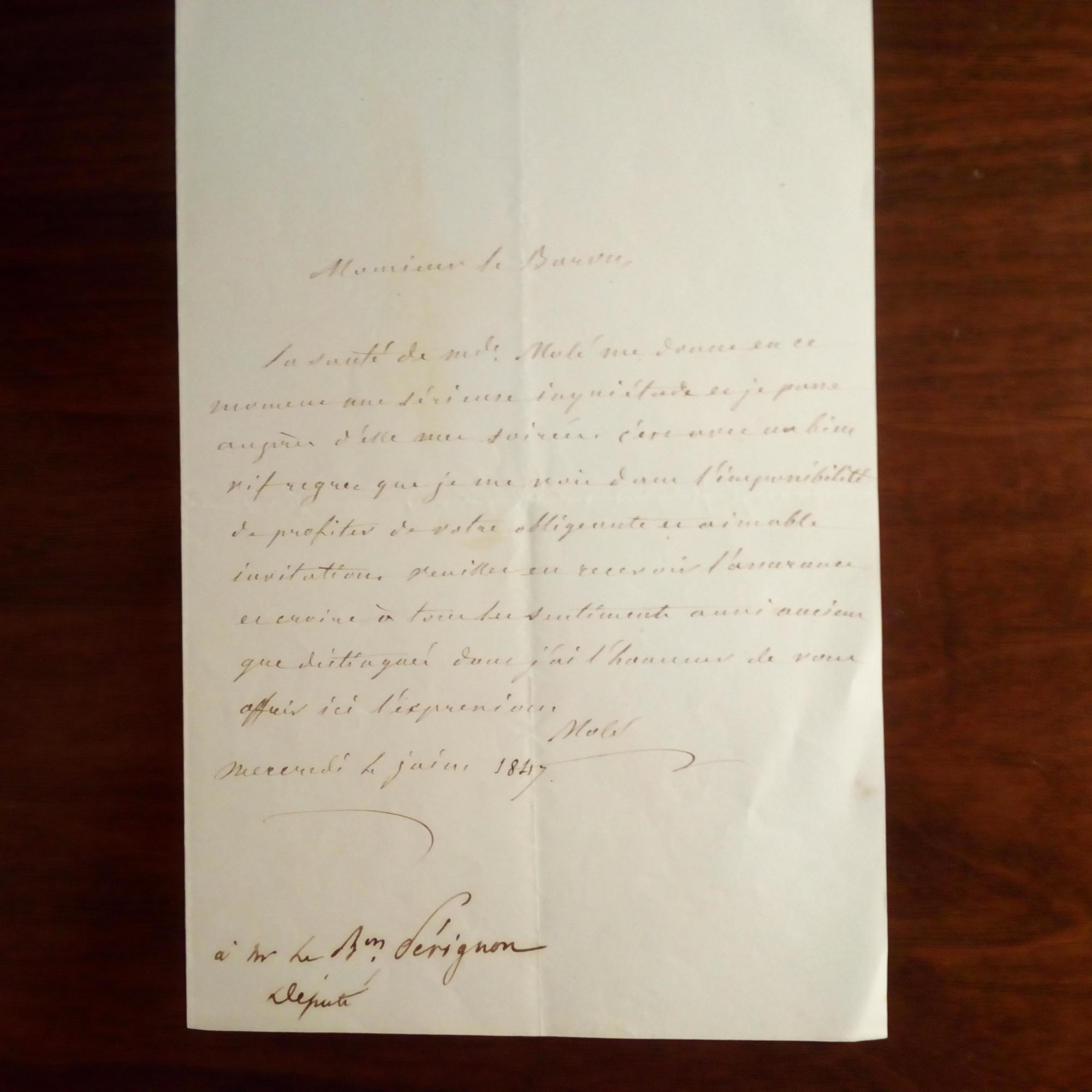 1781-1855, frz. Politiker, u.a. Minister unter Napoleon - Schöner e. Br. m. U., Juni 1847, 1 S. 8°, minimale Altersspuren, beschrift. An den Politiker Baron Sérignon: Ausführl. Absage einer Einladung.