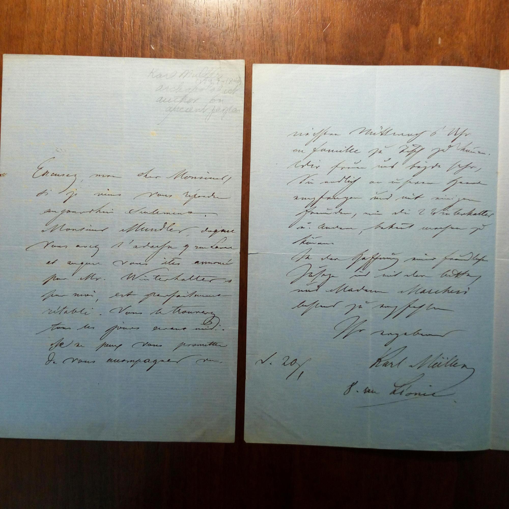 1813-94, dt. klass. Philologe in Paris - 2 e. Briefe mit U., je 2 S. gr. 8°, geringe Altersspuren. Einer frz., einer dt. an denselben Adressaten betr. Einladungen. Will ihn mit dem Hofmaler Franz Xaver Winterhalter bekannt machen u. lässt die Sängerin Marchesi grüßen.