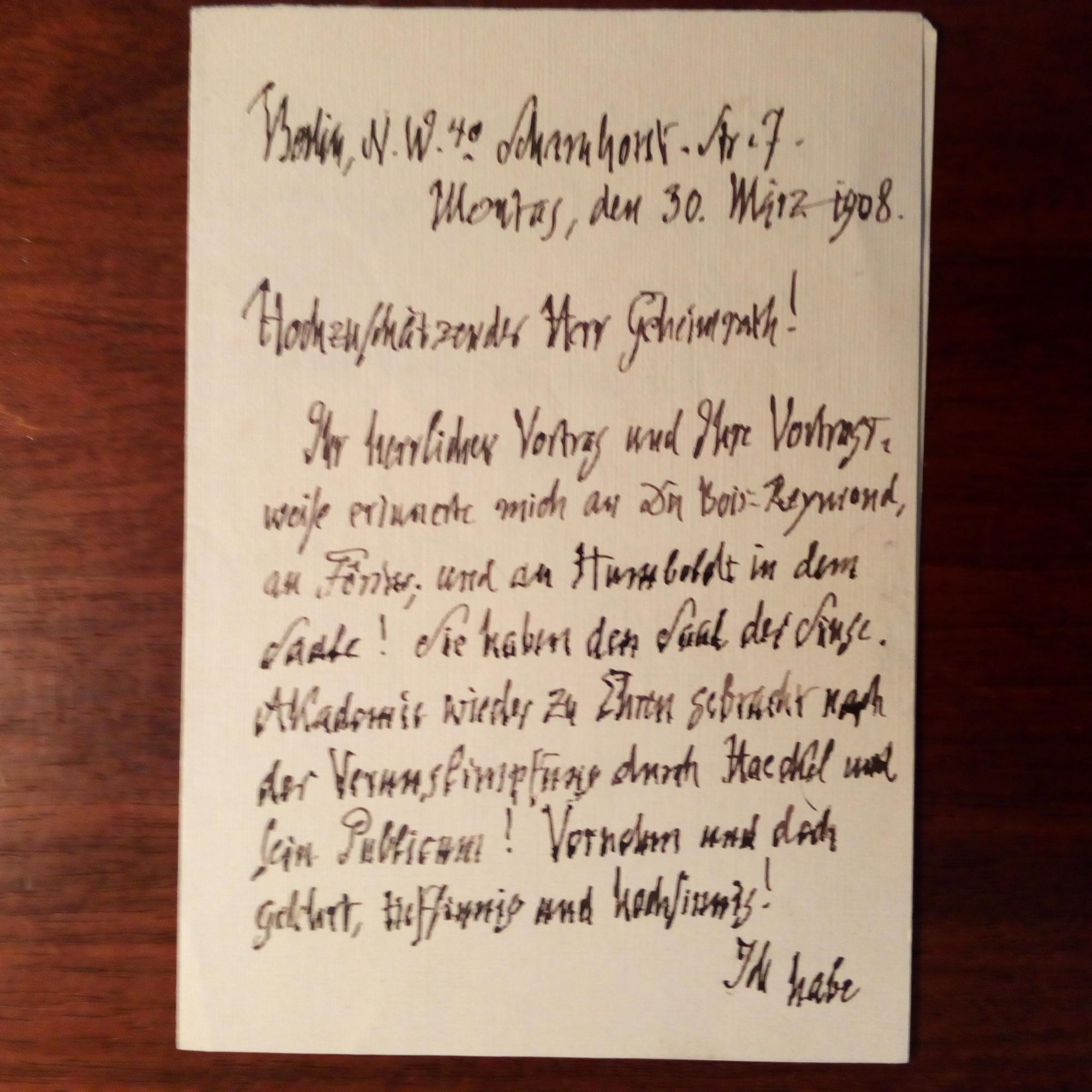 1867-1905, Jurist und Spiritist in Berlin - E. Brief mit U., Berlin 30.3.1908, 1 ½ S. kl. 8°, kl. Schrift. Gratuliert einem Geheimrat zu einem Vortrag: ...erinnerte mich an Du Bois-Raymond, an Förster; und an Humboldt in dem Staate! Sie haben den Saal der Singe-Akademie wieder zu Ehren gebracht nach der Verunglimpfung durch Haeckel und sein Publicum!...