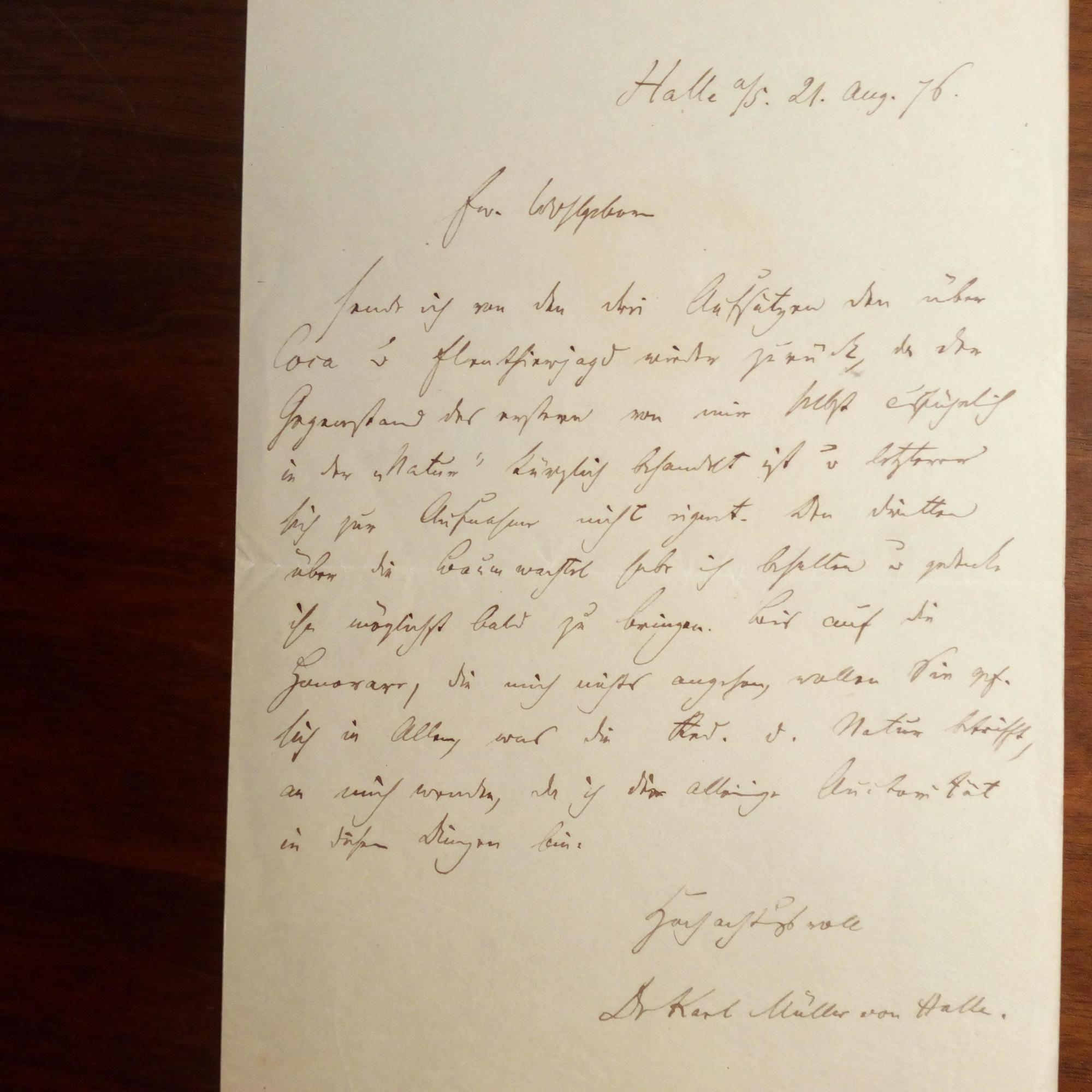 1818-99, Botaniker - E. Br. m. U., Halle 21.8.1876. An den Naturwiss. Karl Ackermann (1841-1903) in Kassel: Schickt Aufsätze zurück. ...Den dritten über die Baumwachtel habe ich behalten ... wollen Sie gefälligst in Allem, was die Red. der Natur betrifft, an mich wenden, da ich die alleinige Autorität in diesen Dingen bin... Beiliegt eine e. postal. Postkarte an dens.