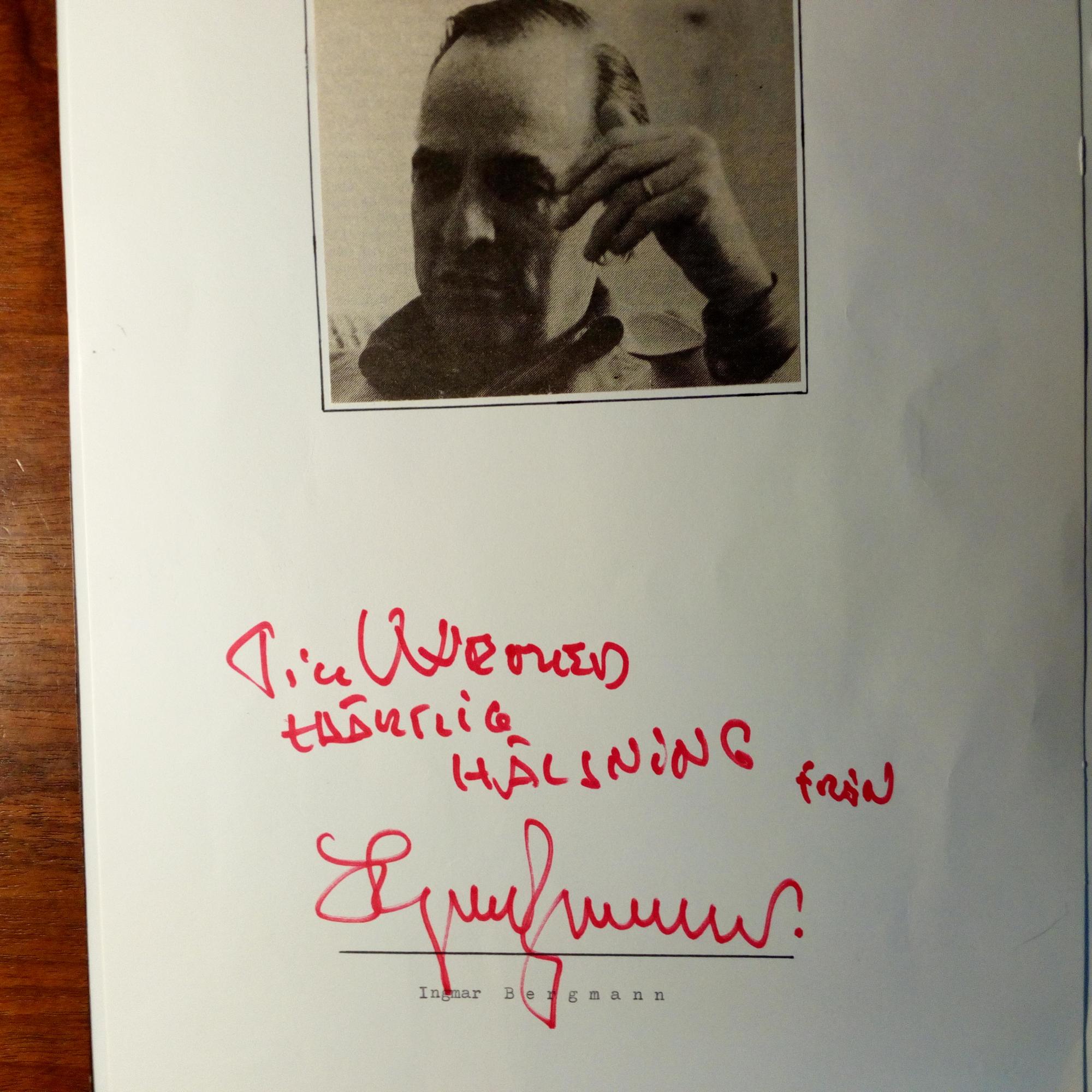 1918-2007, schwed. Regisseur und Drehbuchschreiber - 4°-Blatt mit Widm. (schwed.) und U., unter mont. Druck-Pfo. (70er Jahre). Beiliegt Karte mit U.