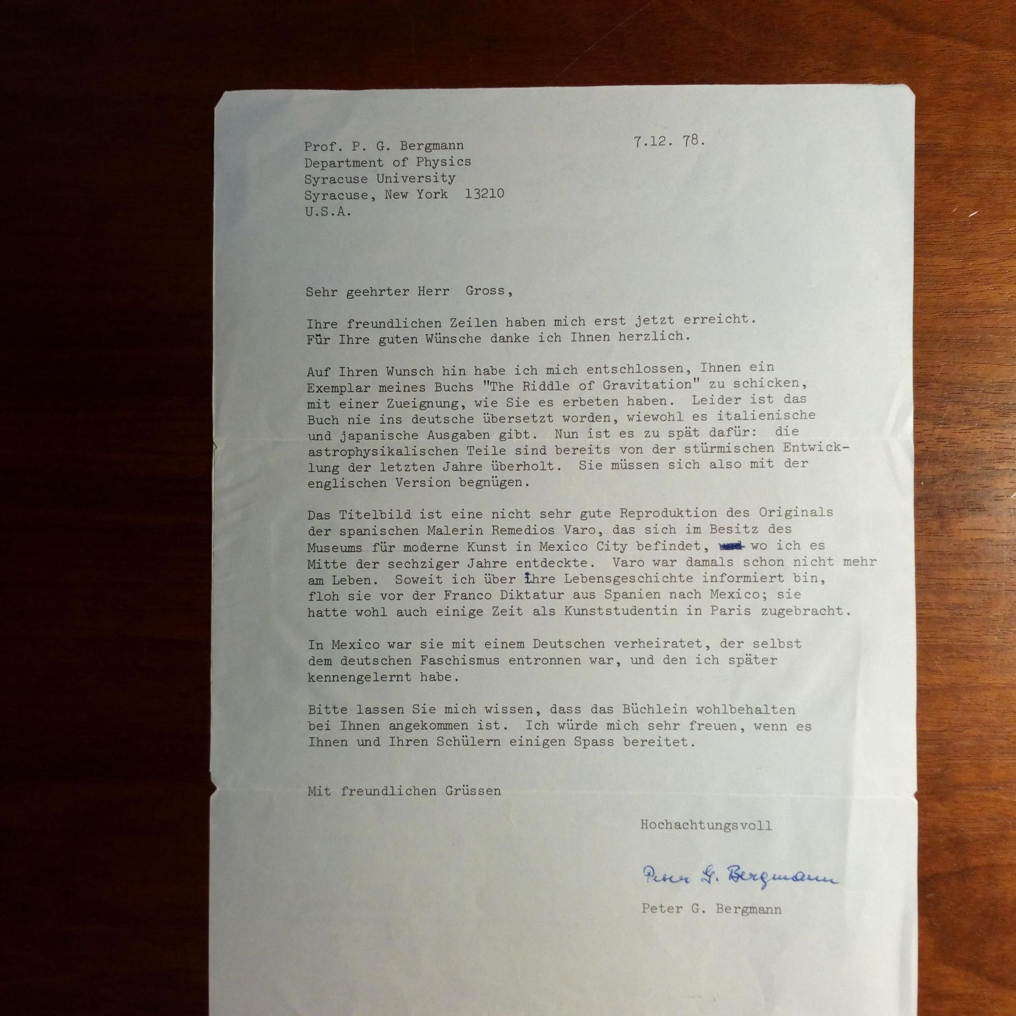 1915-2002, US-Physiker, Schüler von Einstein - Luftpost-Faltbr. m. U., Syracuse 7.12.1978, 1 S. 4°, dicht geschr. Sendet sein Buch "The Riddle of Gravitation" u. gibt Informationen dazu.
