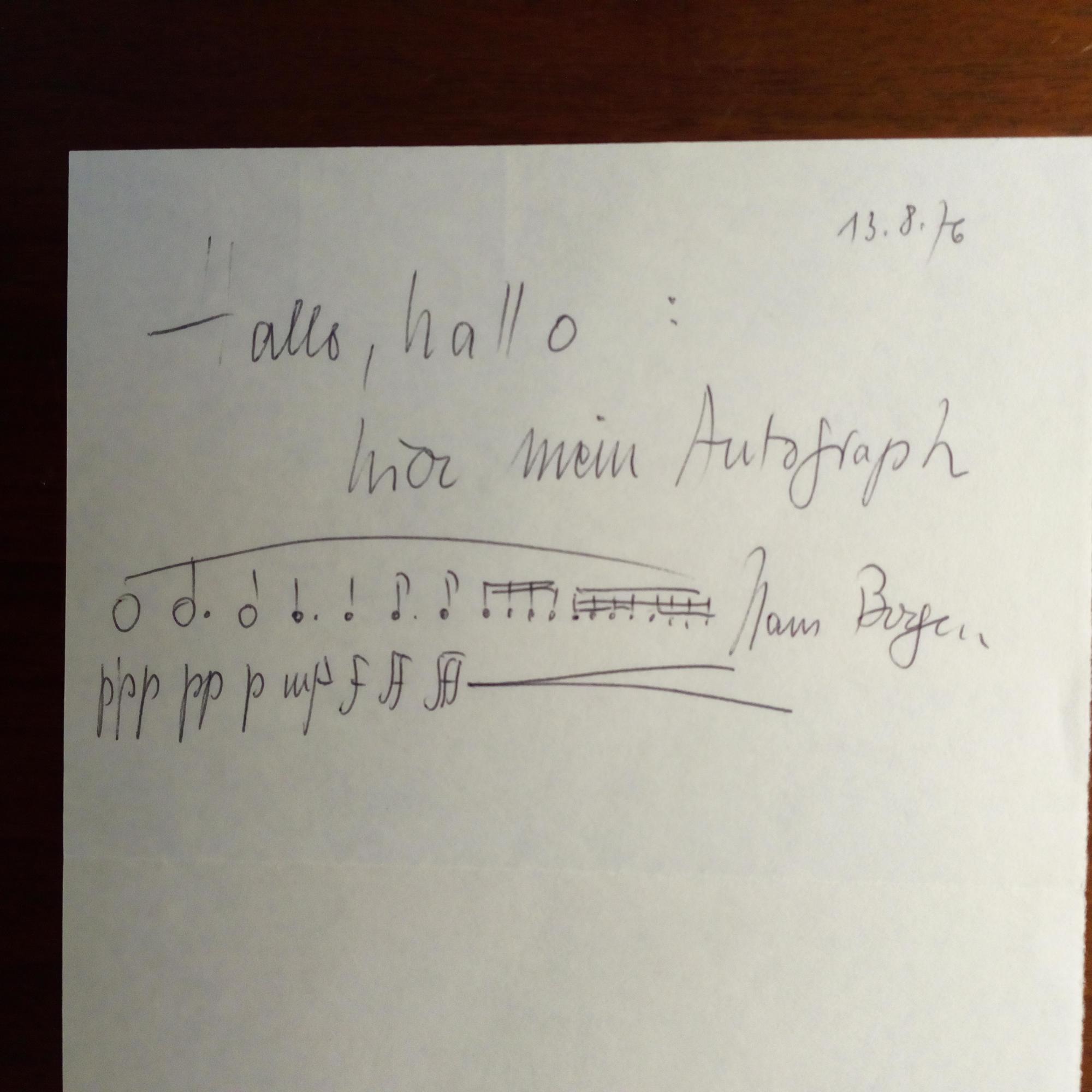 1910-99, Komponist - E. Notenzeile, U. u. D. 13.8.1976, ½ S. 8°. Darüber: "Hallo, hallo: hier ist mein Autograph...".