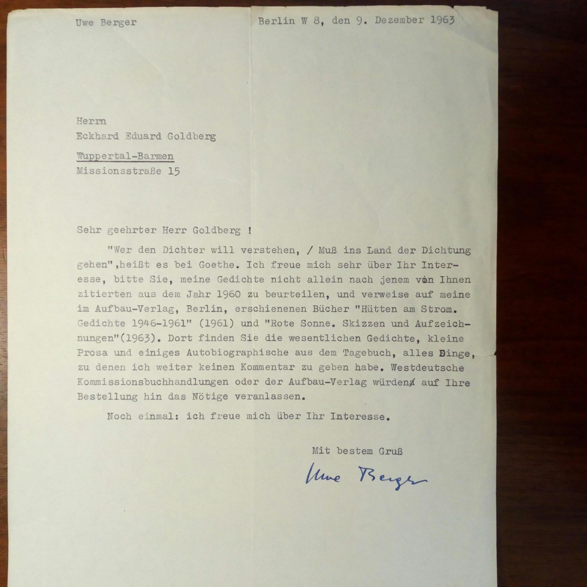 1928-2014, Schriftsteller - Br. m. U., Berlin 9.12.1962, ¾ S. 4°, ger. Gebr.spuren., m. postal. Umschlag. An den Pastor u. Religions-historiker Eckhard Eduard Goldberg in Wuppertal: ...bitte Sie meine Gedichte nicht allein nach jenem von Ihnen zitierten aus dem Jahr 1960 zu beurteilen, und verweise auf meine im Aufbau-Verlag, Berlin, erschienenen Bücher...