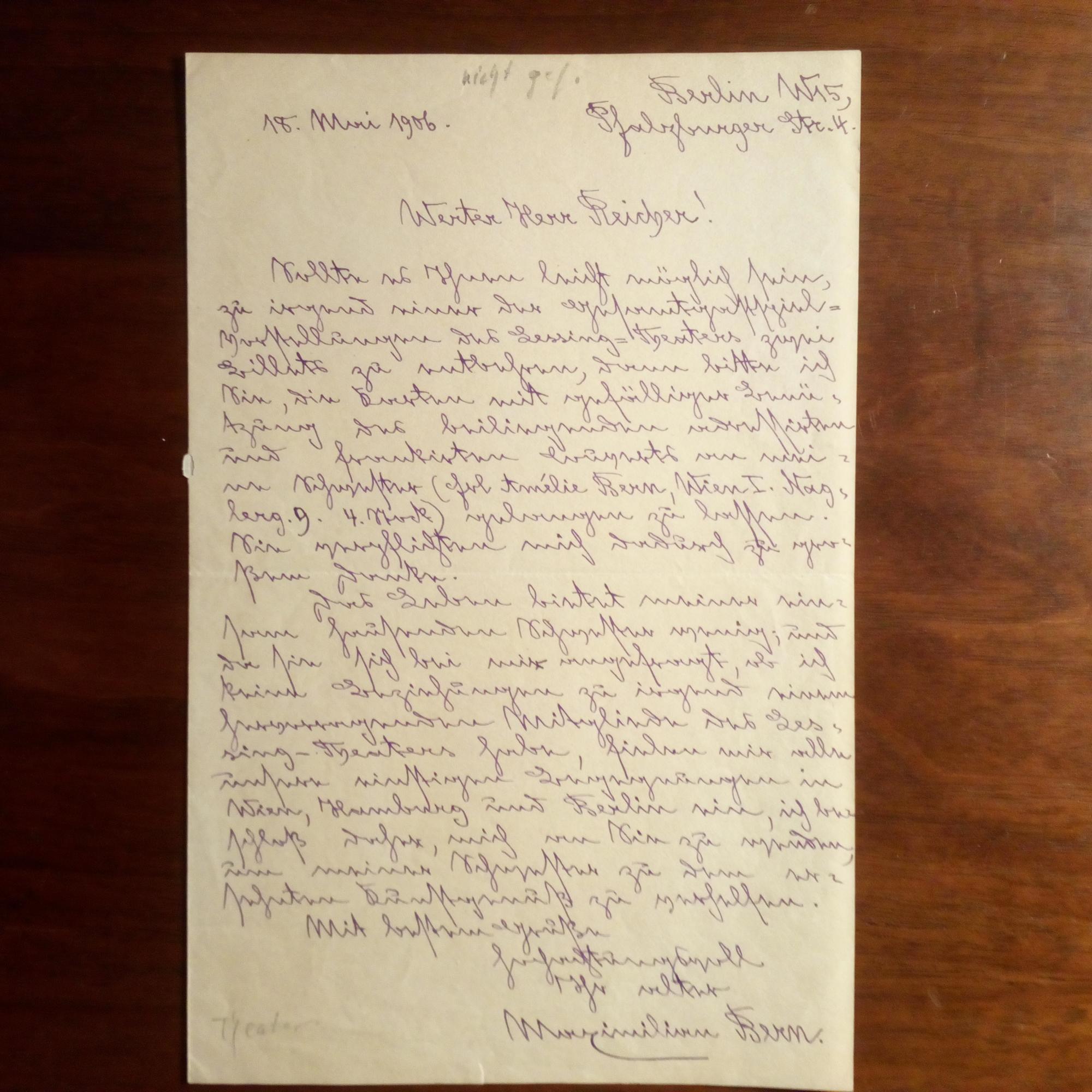 1849-1923, Schriftsteller - E. Br. m. U., Berlin 18.5.1906, 1 S. 8°, dicht geschr. An den Schauspieler u. Regisseur Emanuel Reicher (1849-1924): Bittet ausführl. um 2 Karten für das Lessing-Theater, "um meiner Schwester zu dem ersehnten Kunstgenuß zu verhelfen...".